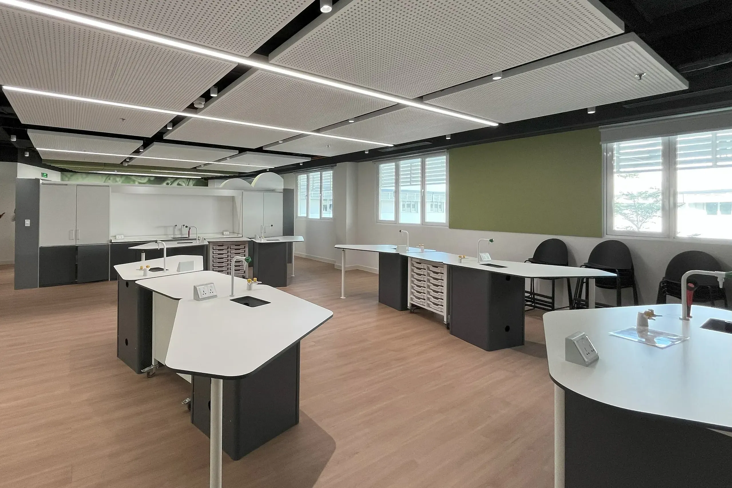 SB Labs collaborated with OUT-2 Design to deliver custom science lab furniture for the practical zones and teachers’ desks for the theory areas. Bespoke student workstations and integrated mobile storage cabinets support collaboration and provide easy access to equipment.