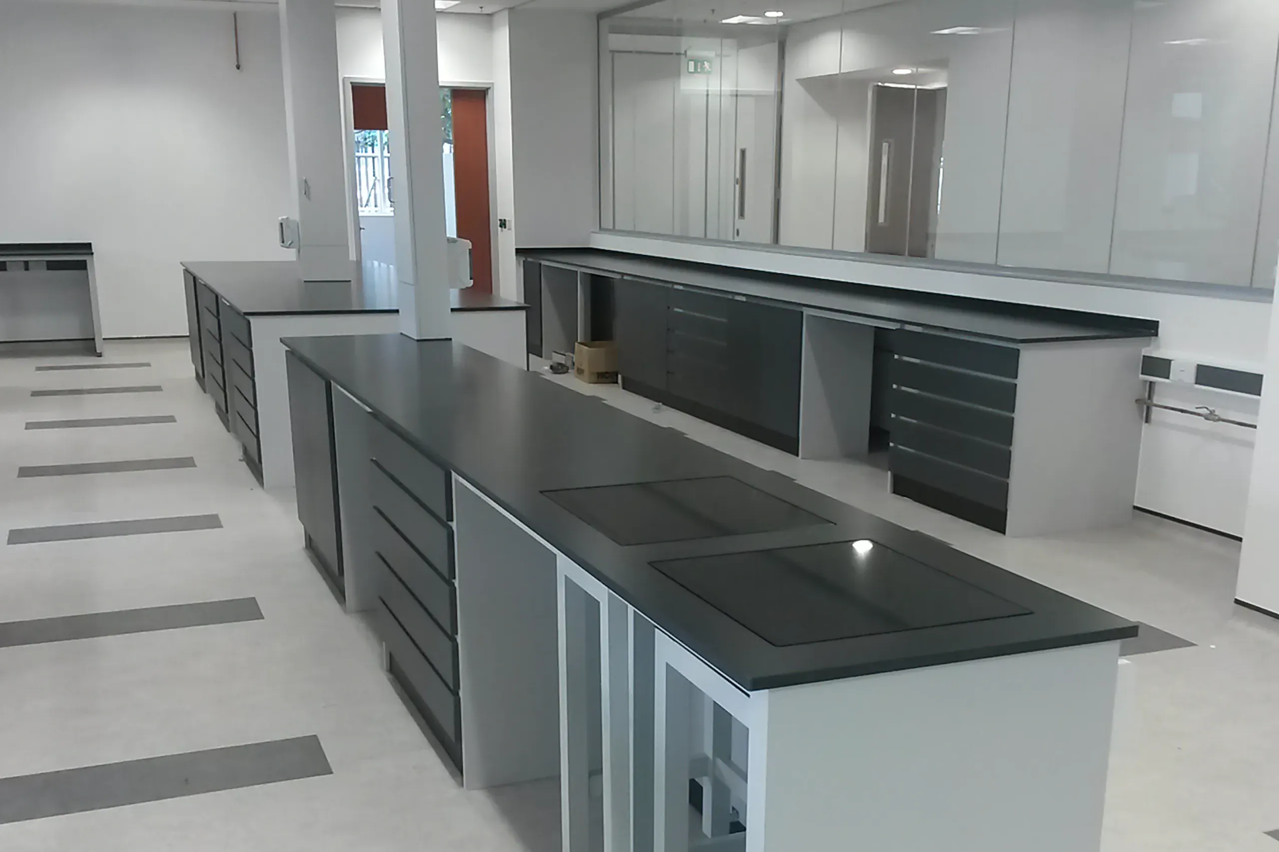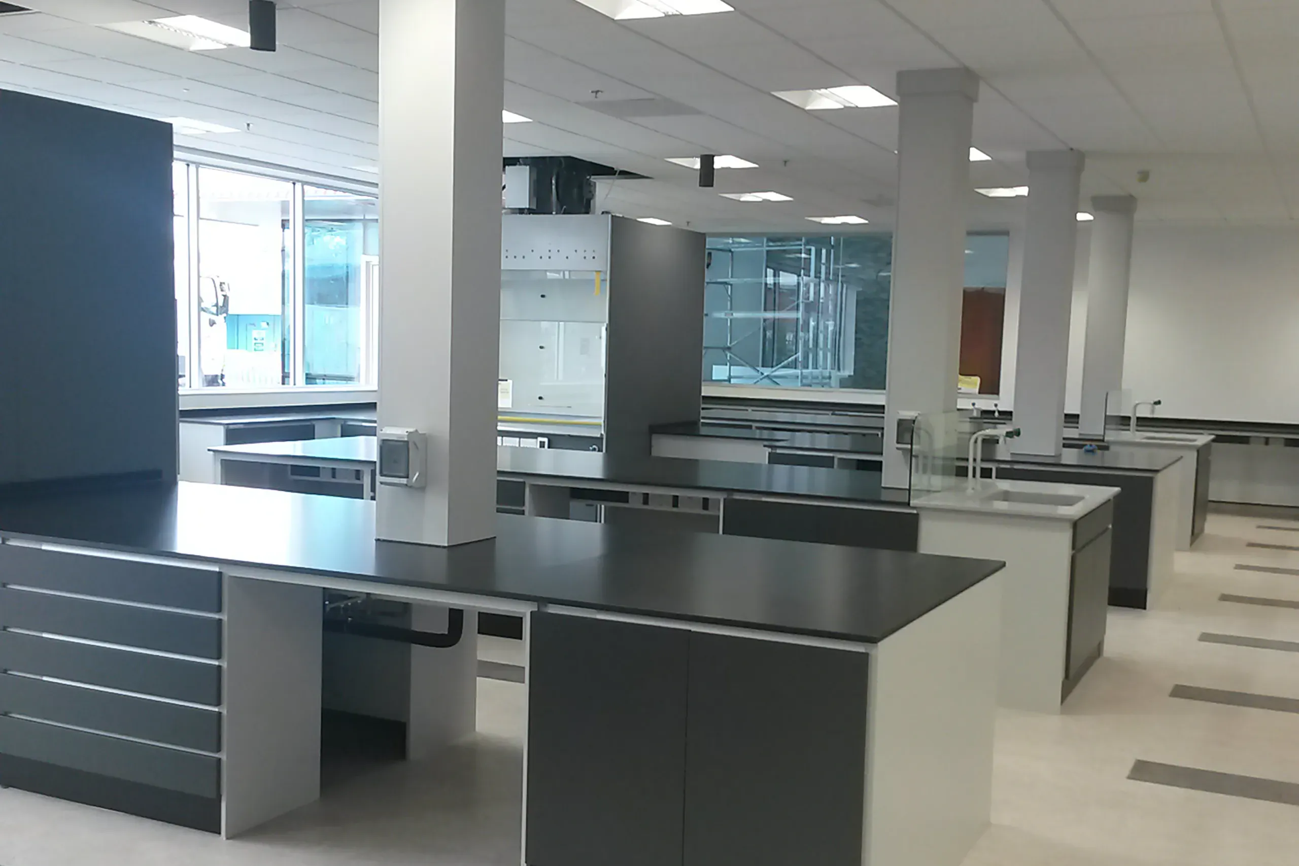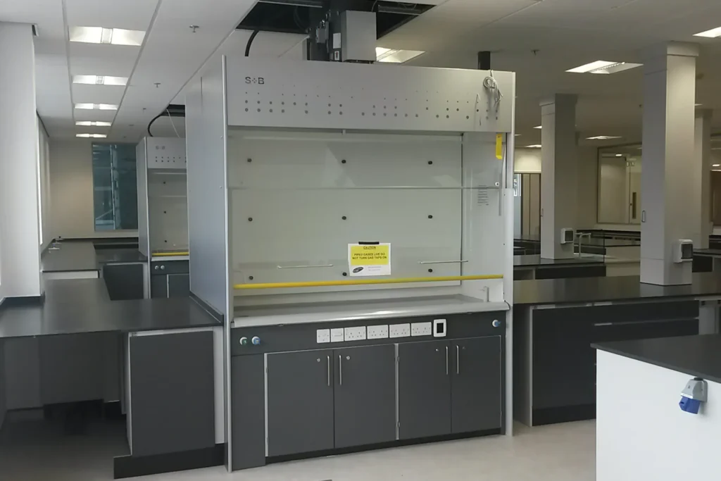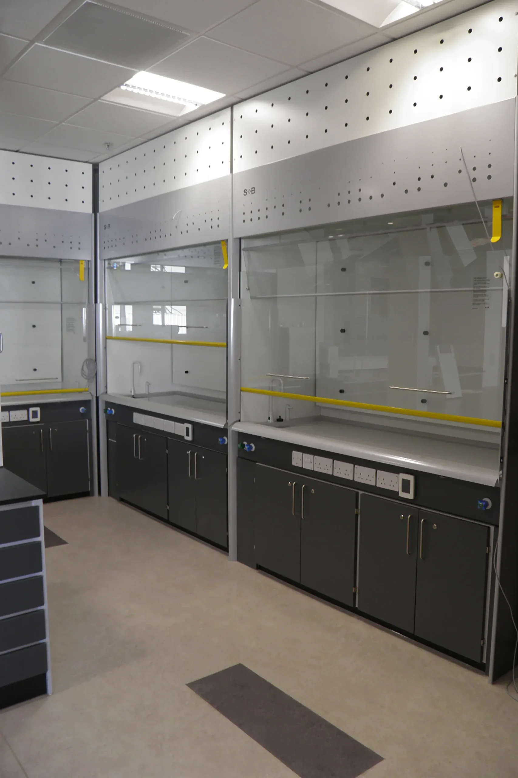 SB Labs UK were approached by Bardsley construction to form part of their team to deliver project, having been appointed by Bardsley during the very early stages of the process, SB Labs UK were able to engage directly with the end user groups to design each laboratory area to the varying and unique needs of each department. This required a mixture of ‘fixed pedestal’ furniture, heavy duty ‘Exemplaire C frame’ and over 60 fixed fume cupboards, varying from highly serviced ‘walk-in’ fume units to bench mounted extended width units.