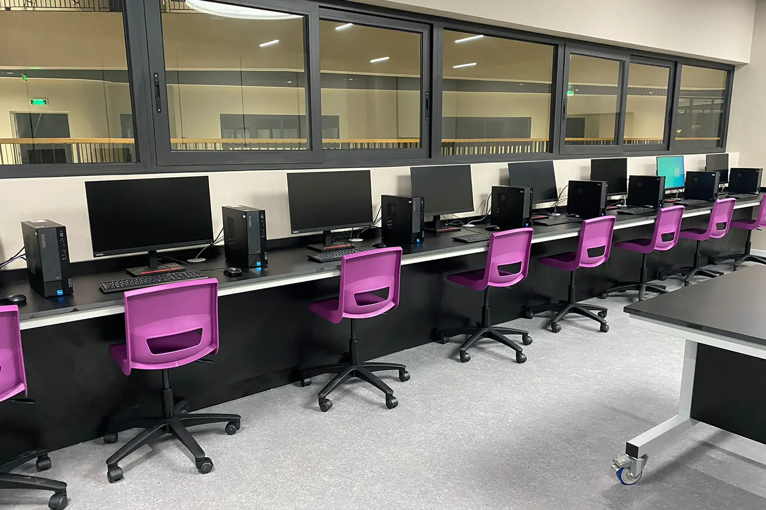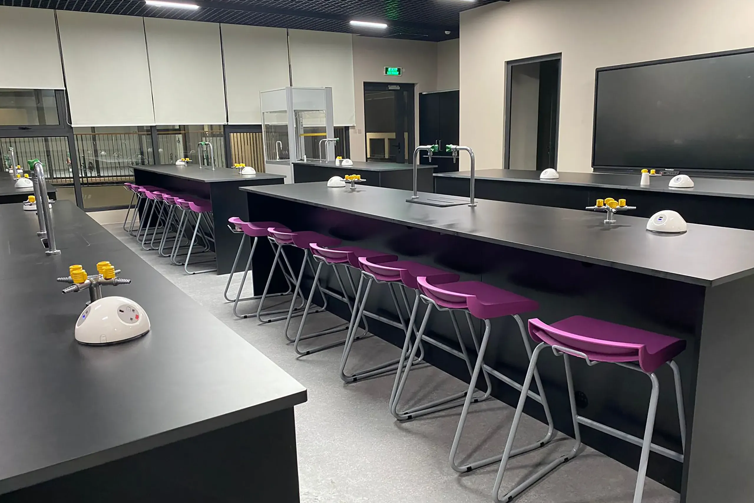 The school labs furnished by SB Labs are characterised by their striking colour palette and functionality. They feature straight-line benching with Fundermax black worktops, black front doors, panels, and fuchsia stools, creating a visually impactful, minimalist aesthetic. The science lab benches are fitted with under-bench cupboards and trays for organised storage. Sink lids seamlessly integrate into the worktop, offering additional usable work surface when needed.