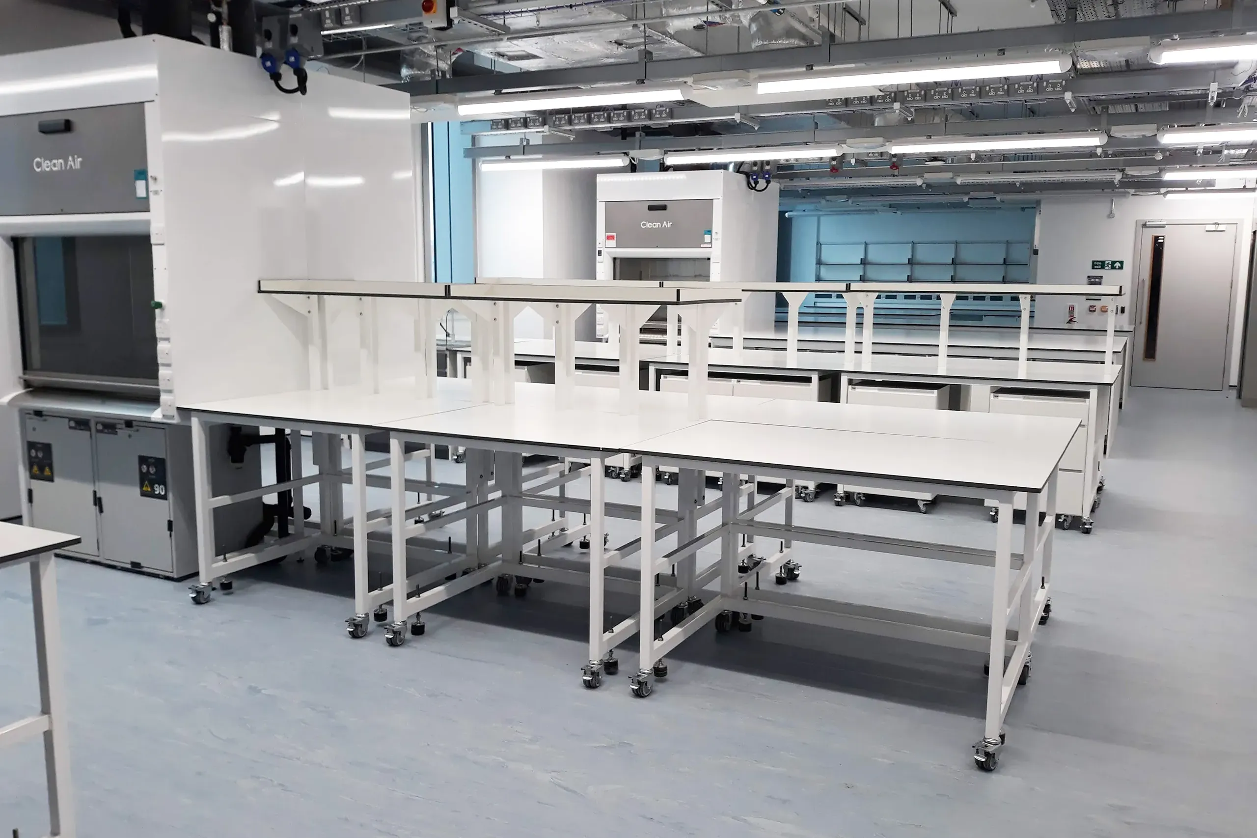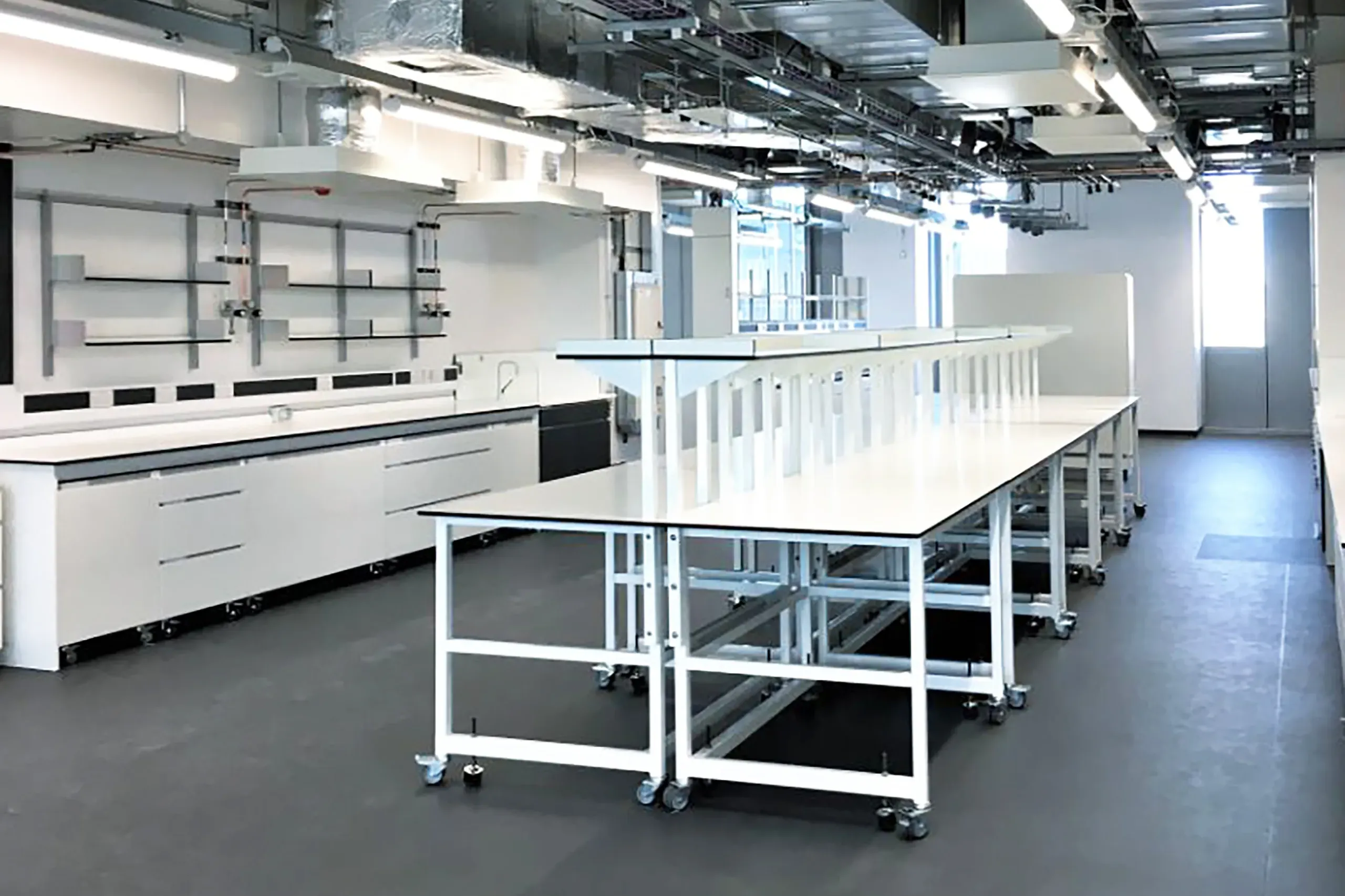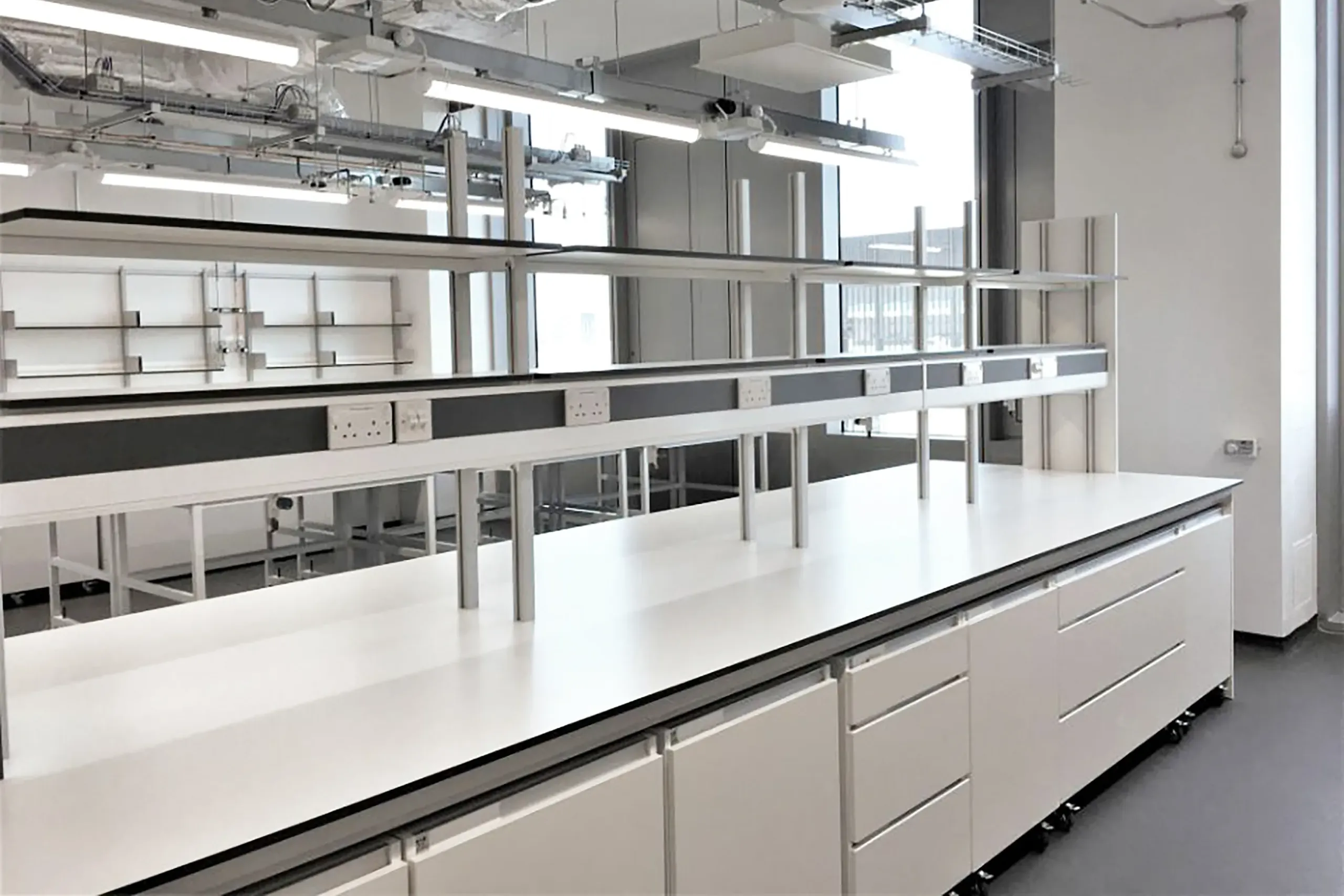 SB Labs have previously worked on 15 different projects for the University of Manchester, including the National Graphene Institute, completed in 2015. For the Henry Royce Institute, we manufactured and installed bespoke laboratory furniture, using two of our most popular lab bench systems, the Exemplaire C frame and Exemplaire Column. Both systems combining heavy duty functionality with attractive contemporary styling, while facilitating mobile push-under storage cabinetry.