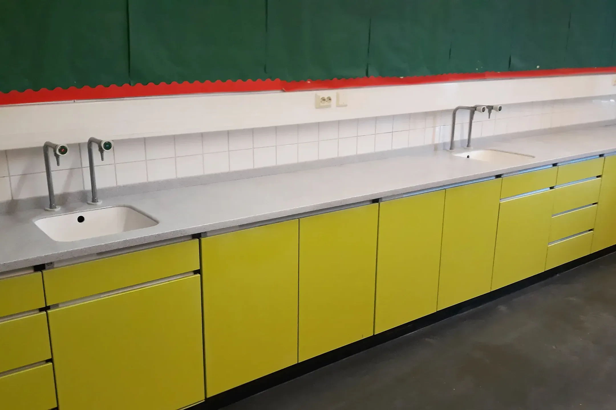 The innovative and functional design of the SpaceStation school furniture system is complemented by the color pallet chosen by the school, the black flooring and under bench panels giving the impression of a floating workstation, while the dusk worktops create a feeling of space and light. The lime green cupboards doors and drawers fronts add a vibrant note and transform the rooms in inspirational environments.