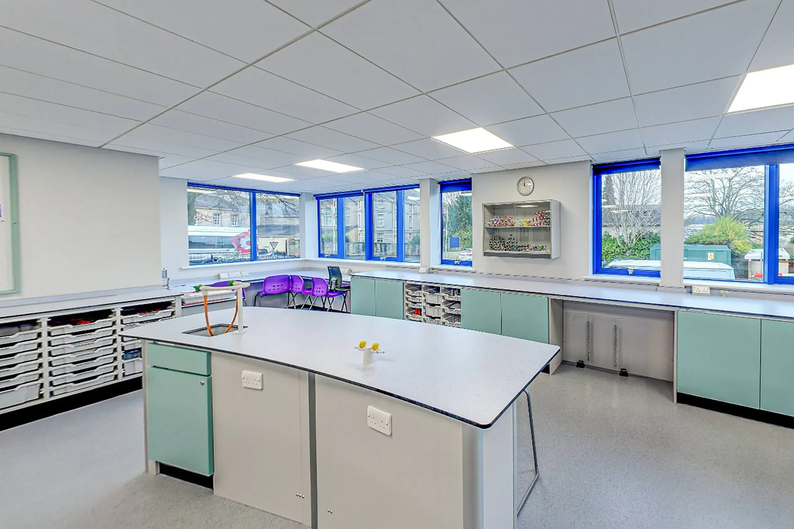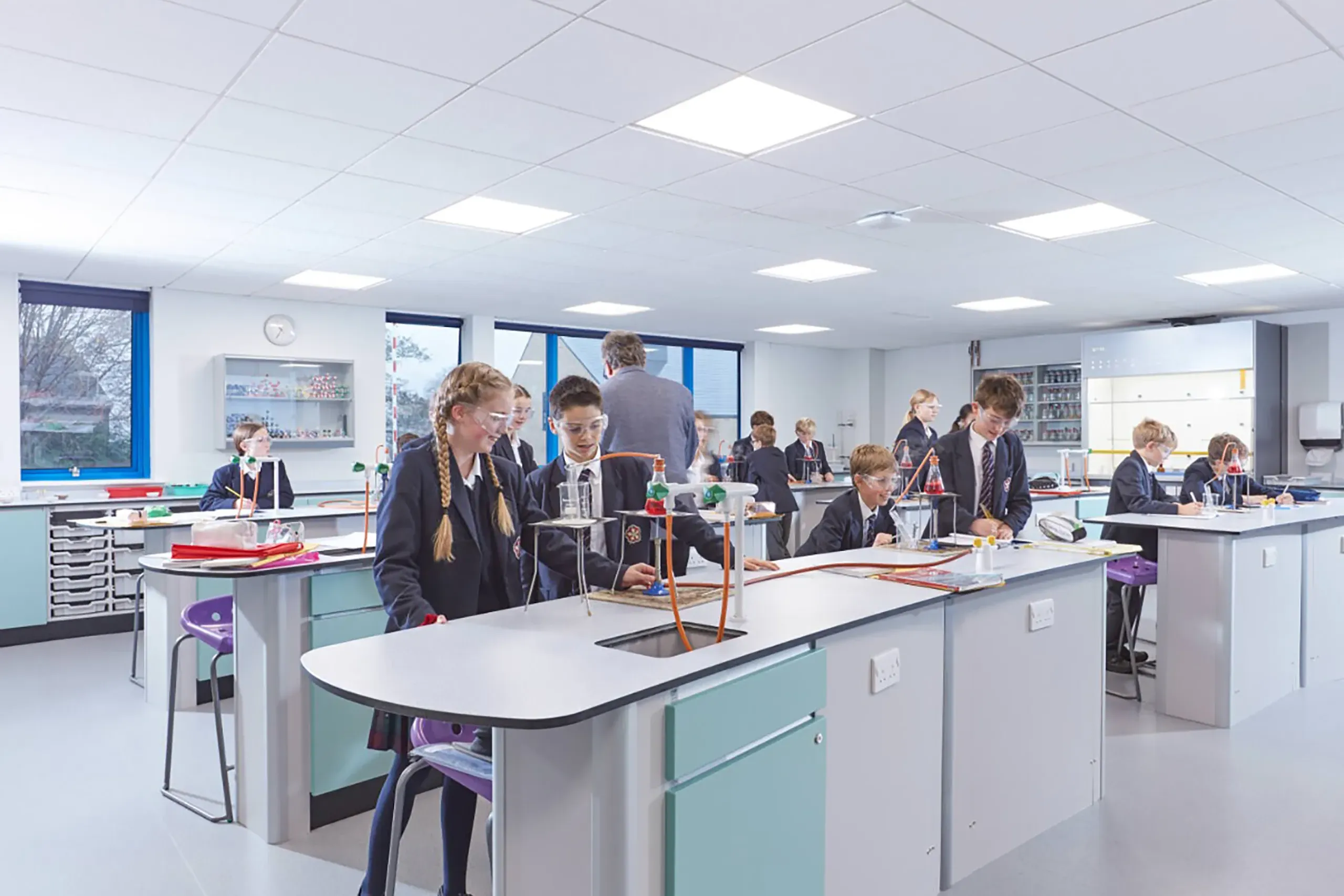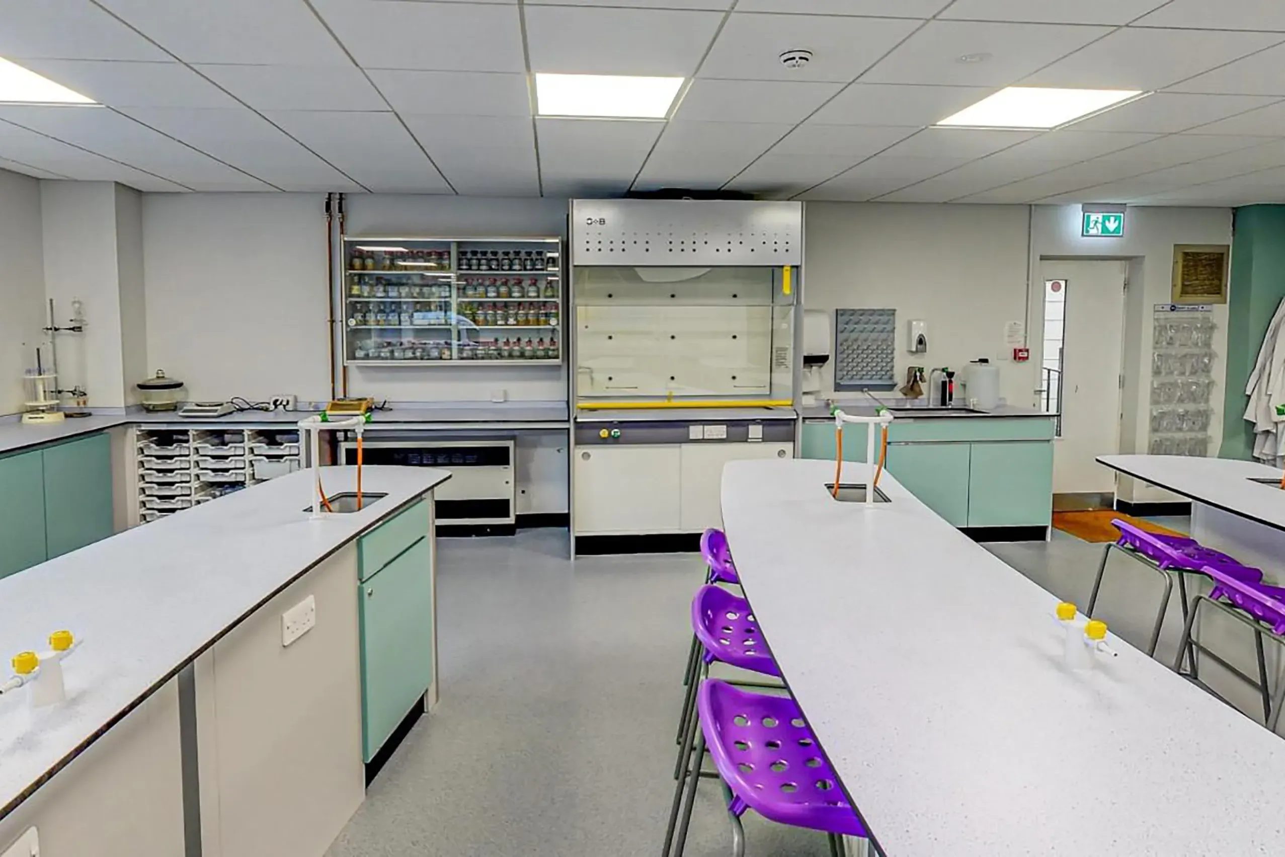Each laboratory includes Crescent student benches designed to facilitate both practical and theoretical learning, as well as additional wall benching that incorporates essential storage and IT areas. To ensure safe experimentation, two Ecoline ducted fume cupboards were installed, alongside teacher demonstration desks.