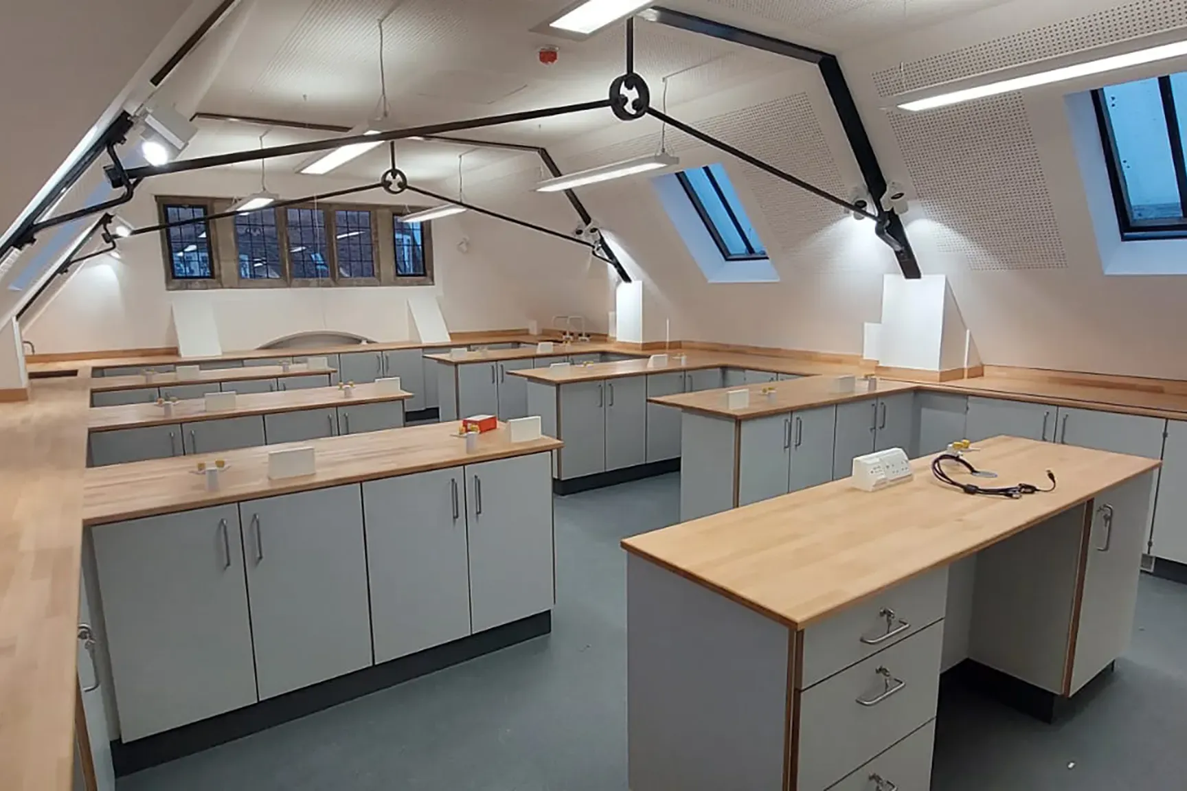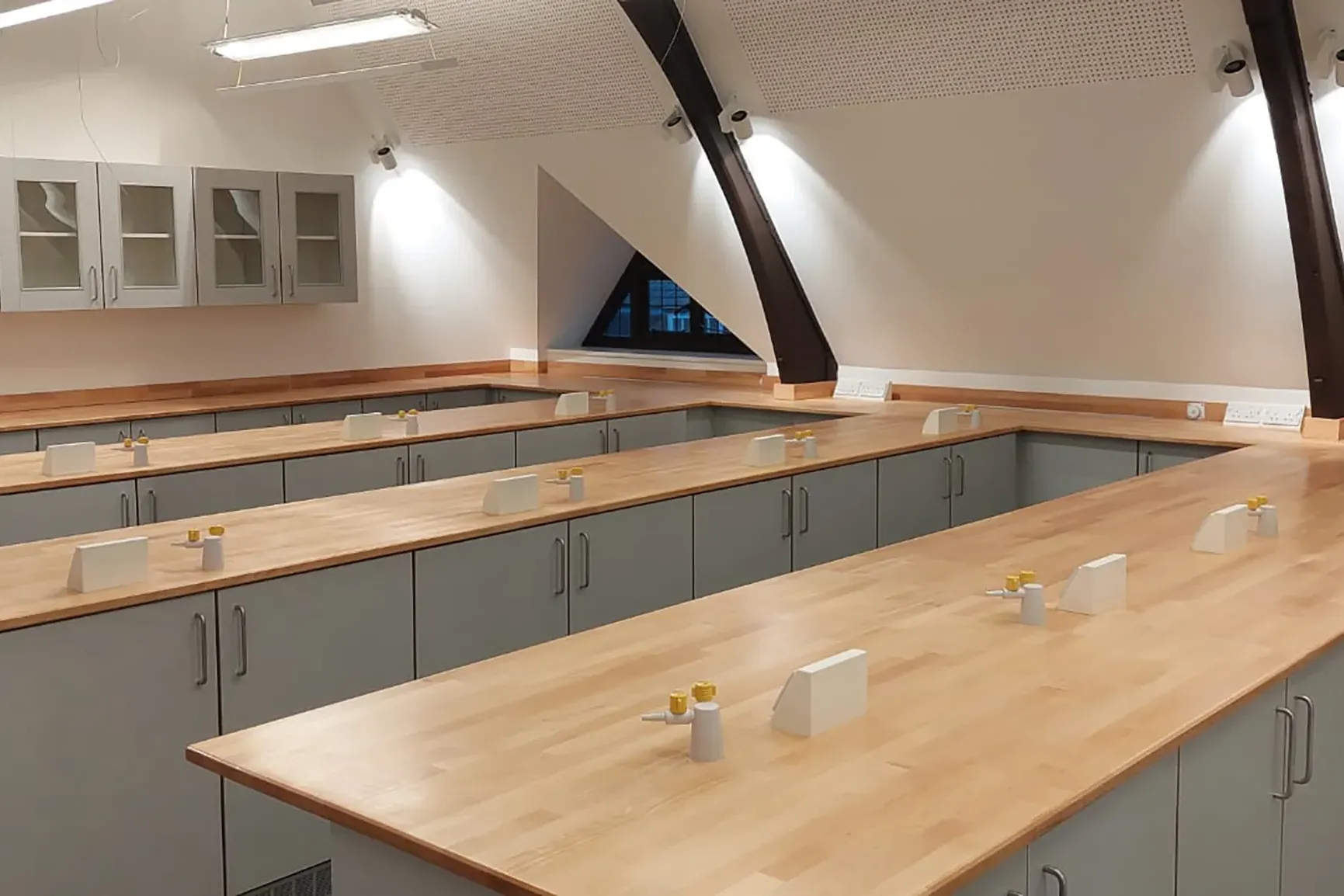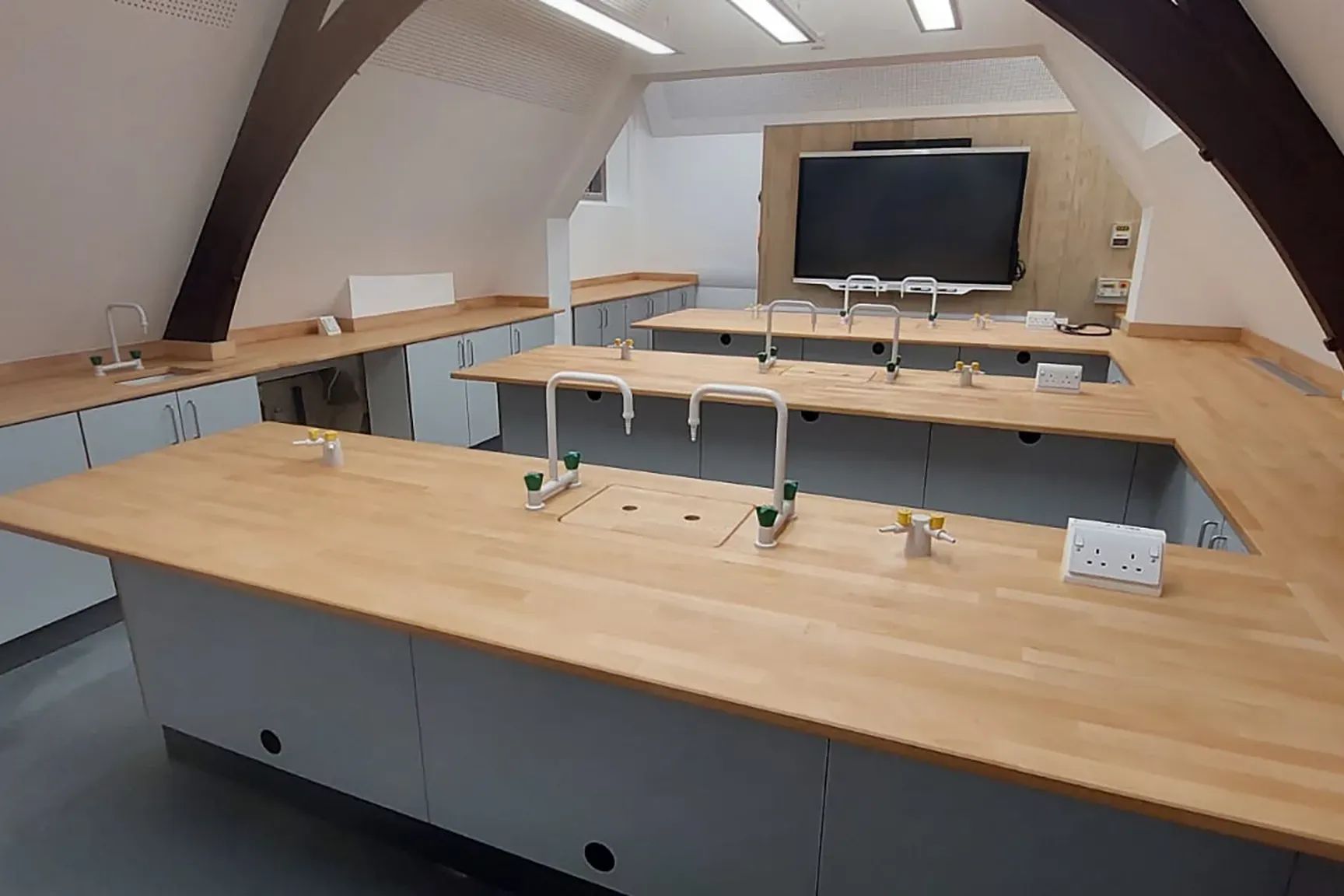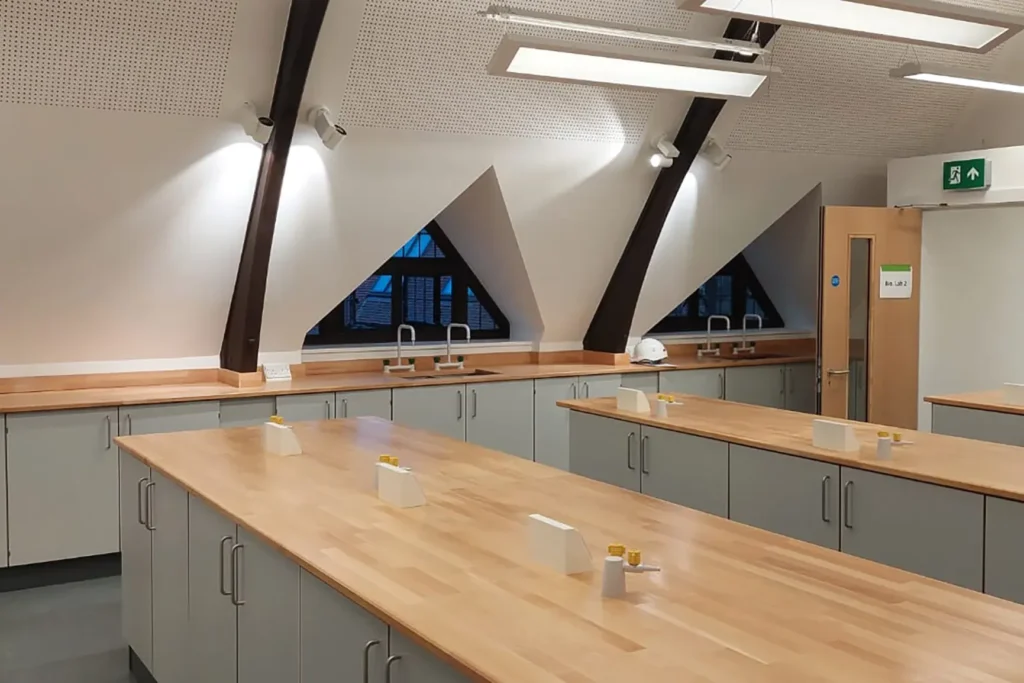 The integration of the newly fitted Biology and Chemistry labs by SB Labs UK, within one of the school’s exquisite 13th-century buildings, exemplifies a harmonious convergence of the old and the new. By seamlessly combining beautiful wooden worktops and contemporary functionality, these labs embody both aesthetic appeal and practicality.