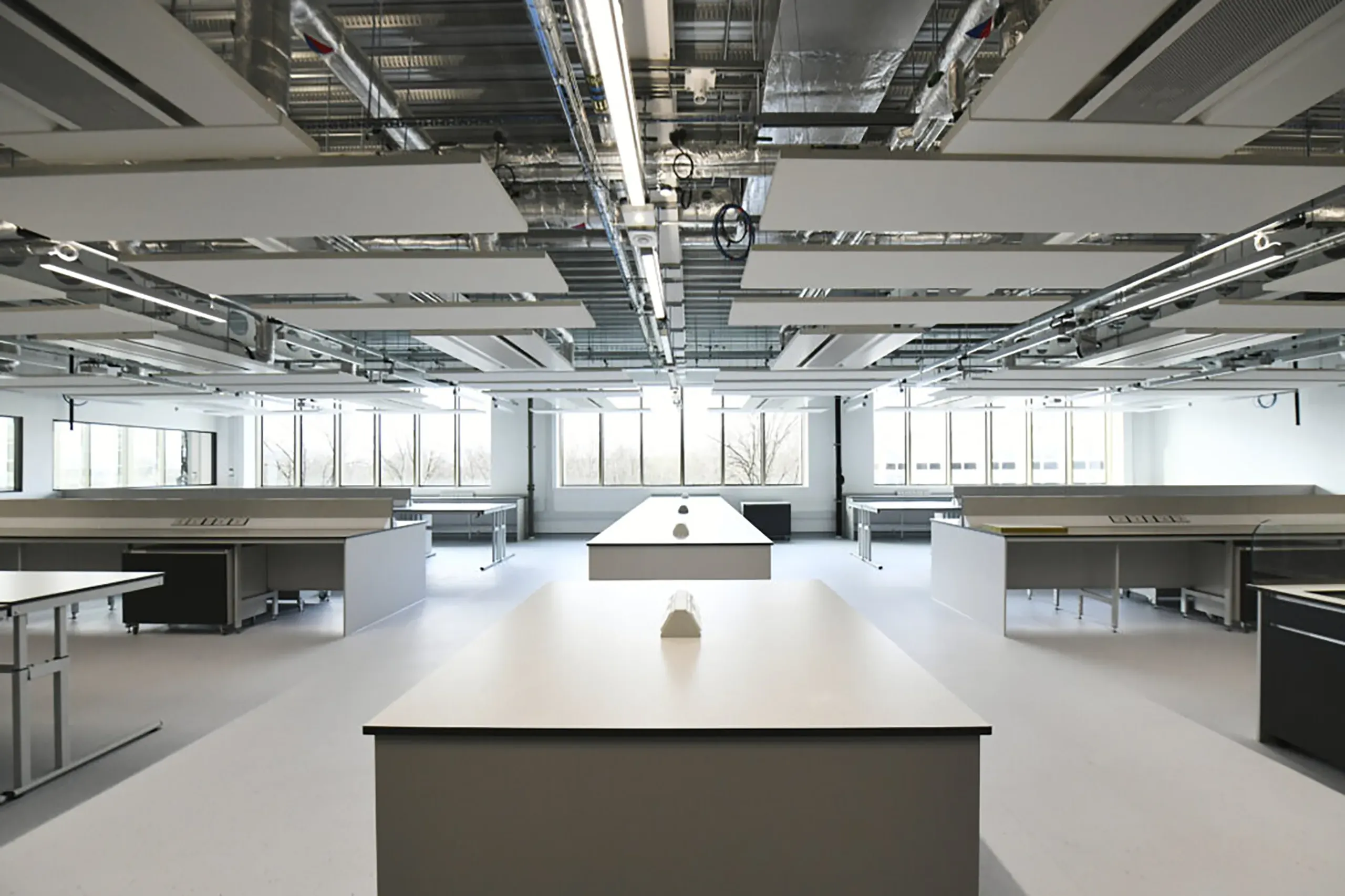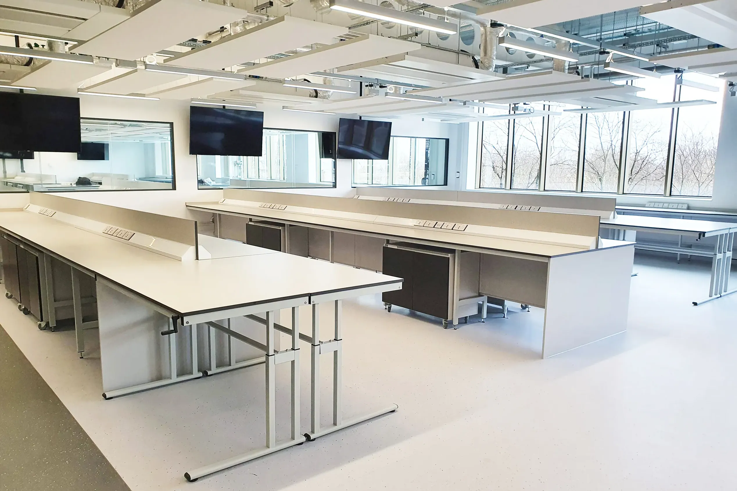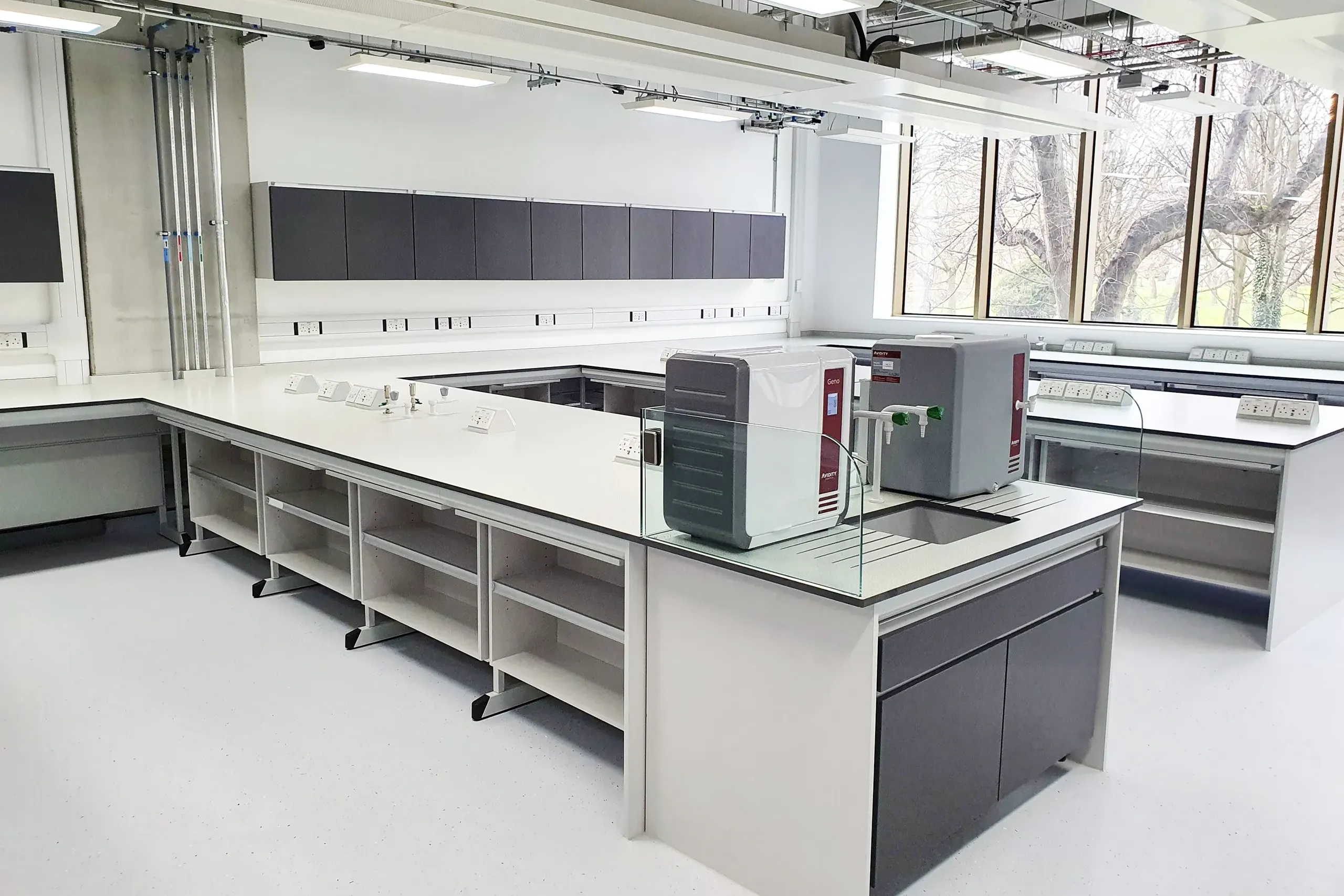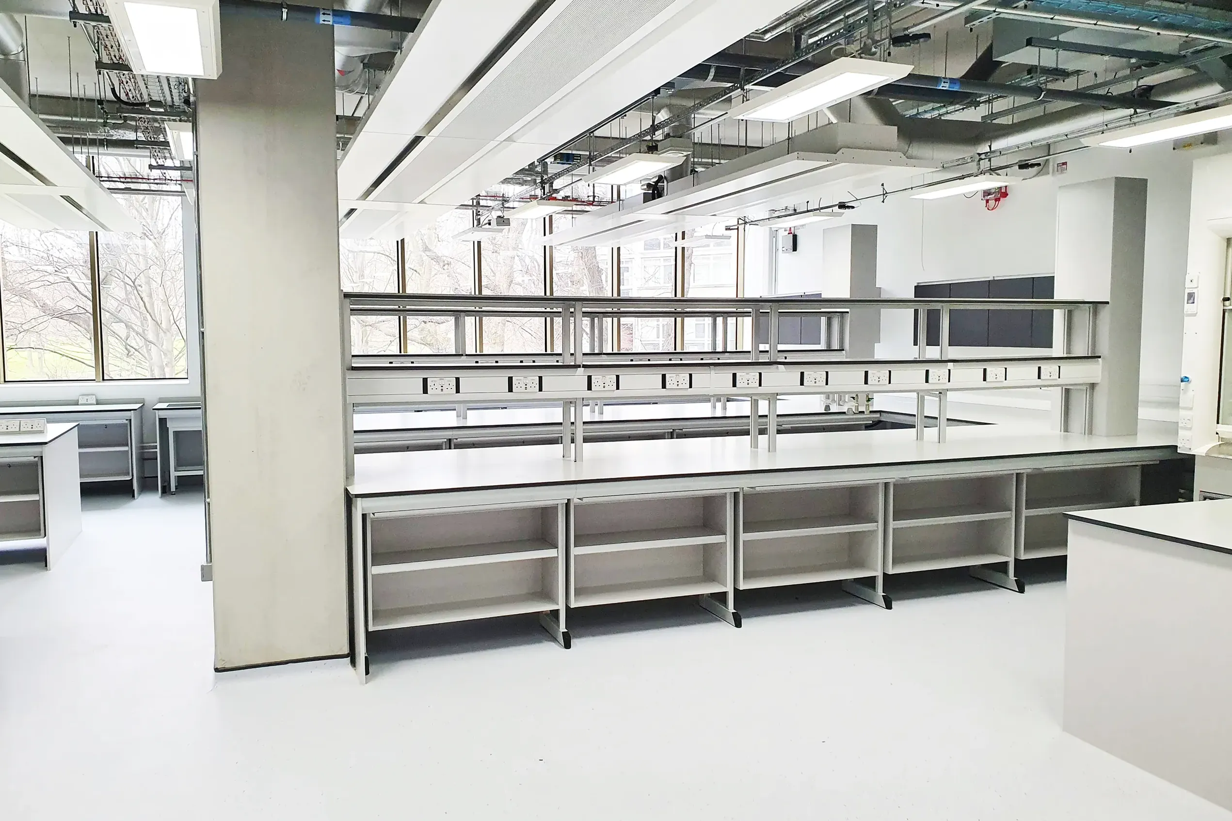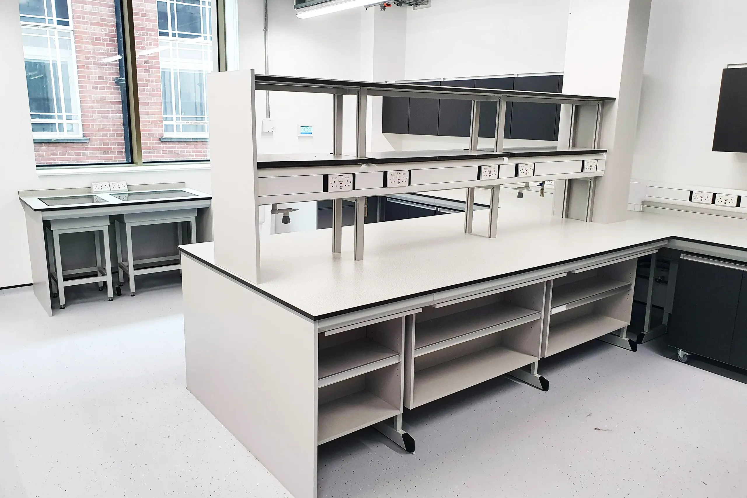 SB Labs UK were appointed to supply and install furniture across approx 65 laboratories and specialist rooms, and the preferred system chosen by the client was the Exemplaire C frame with a combination of mobile and suspended cupboards and Trespa Worktops.