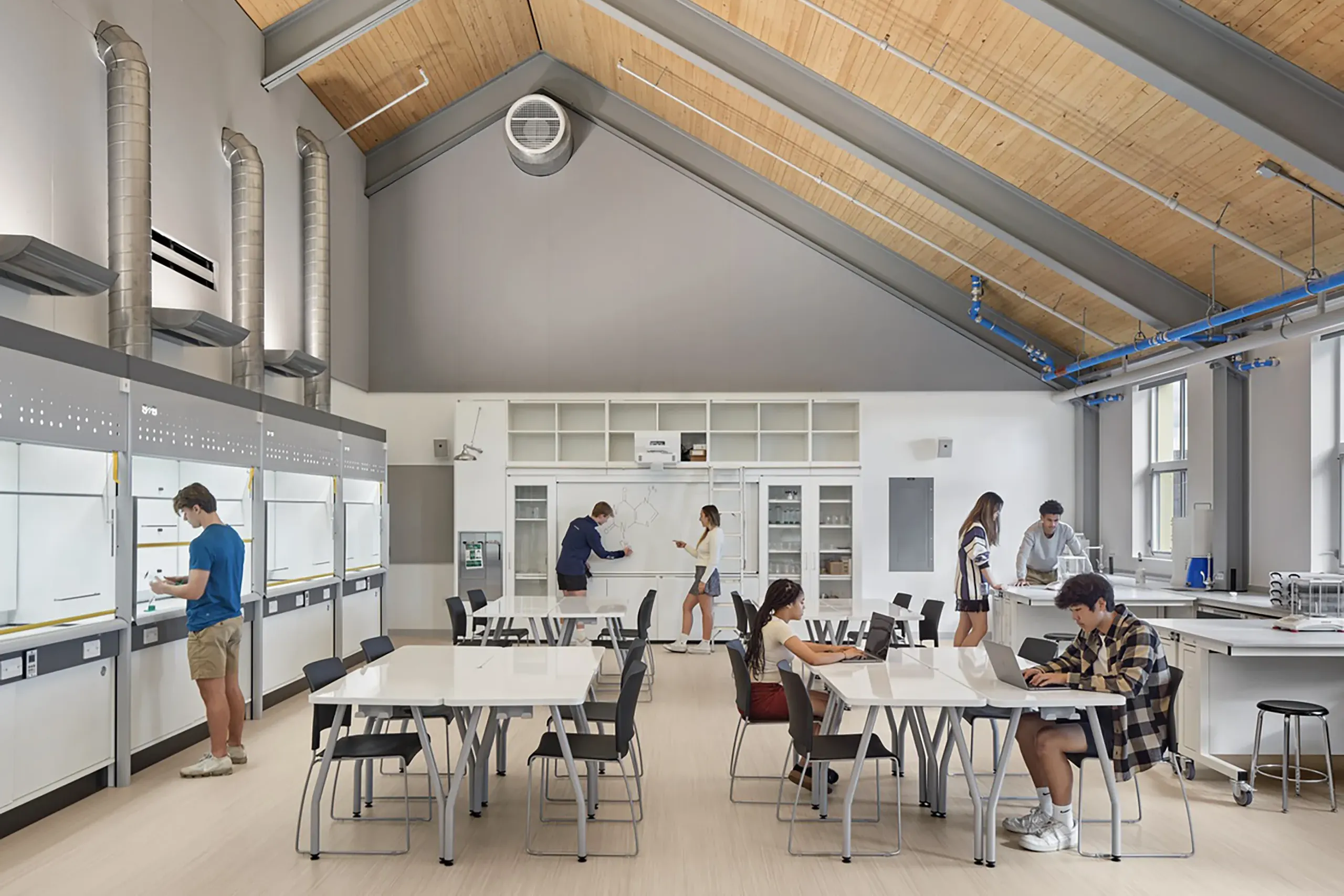 The SpaceSaver teaching walls served as multifunctional units, offering storage, display areas, and integrated technology capabilities. The recirculatory Mobiline and ducted Ecoline fume cupboards provided a safe and efficient solution for science labs environments.