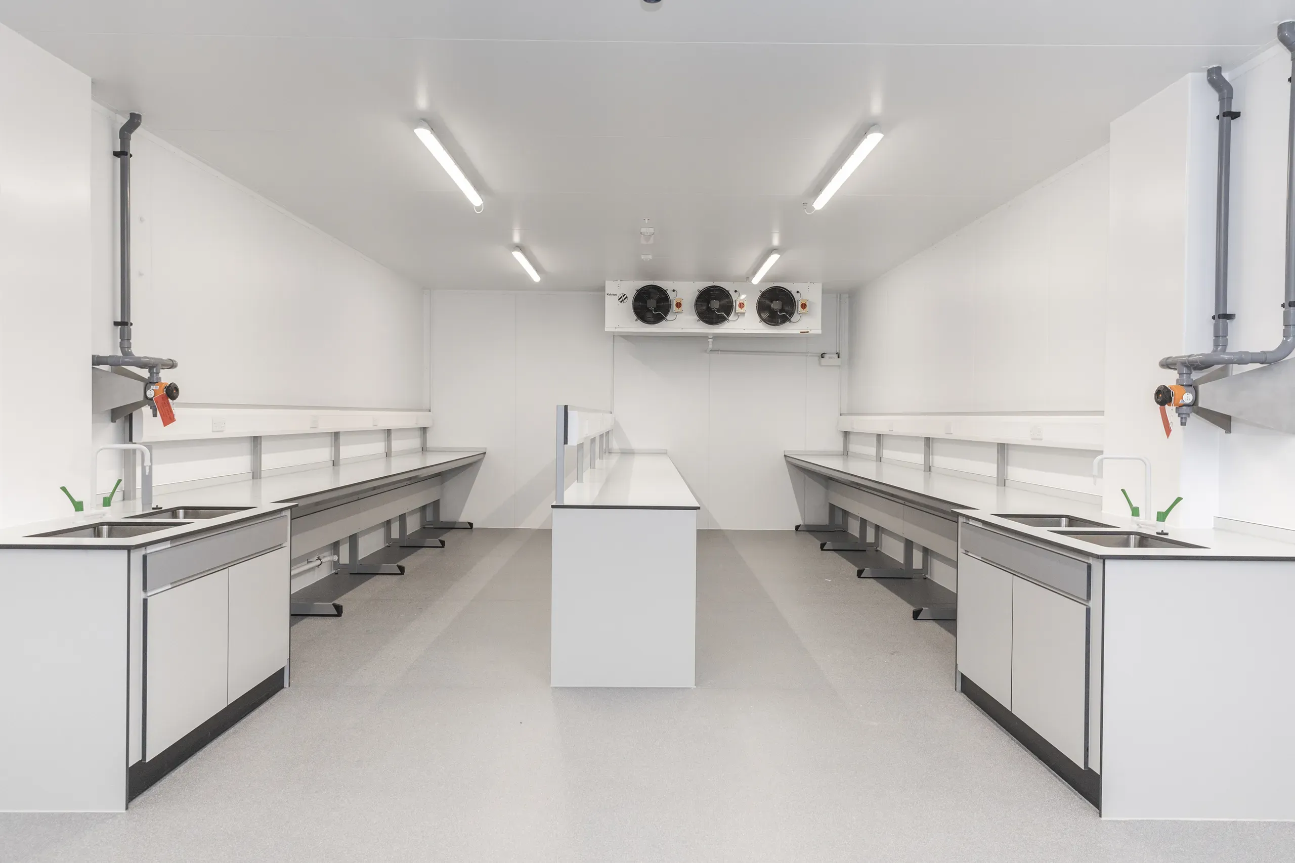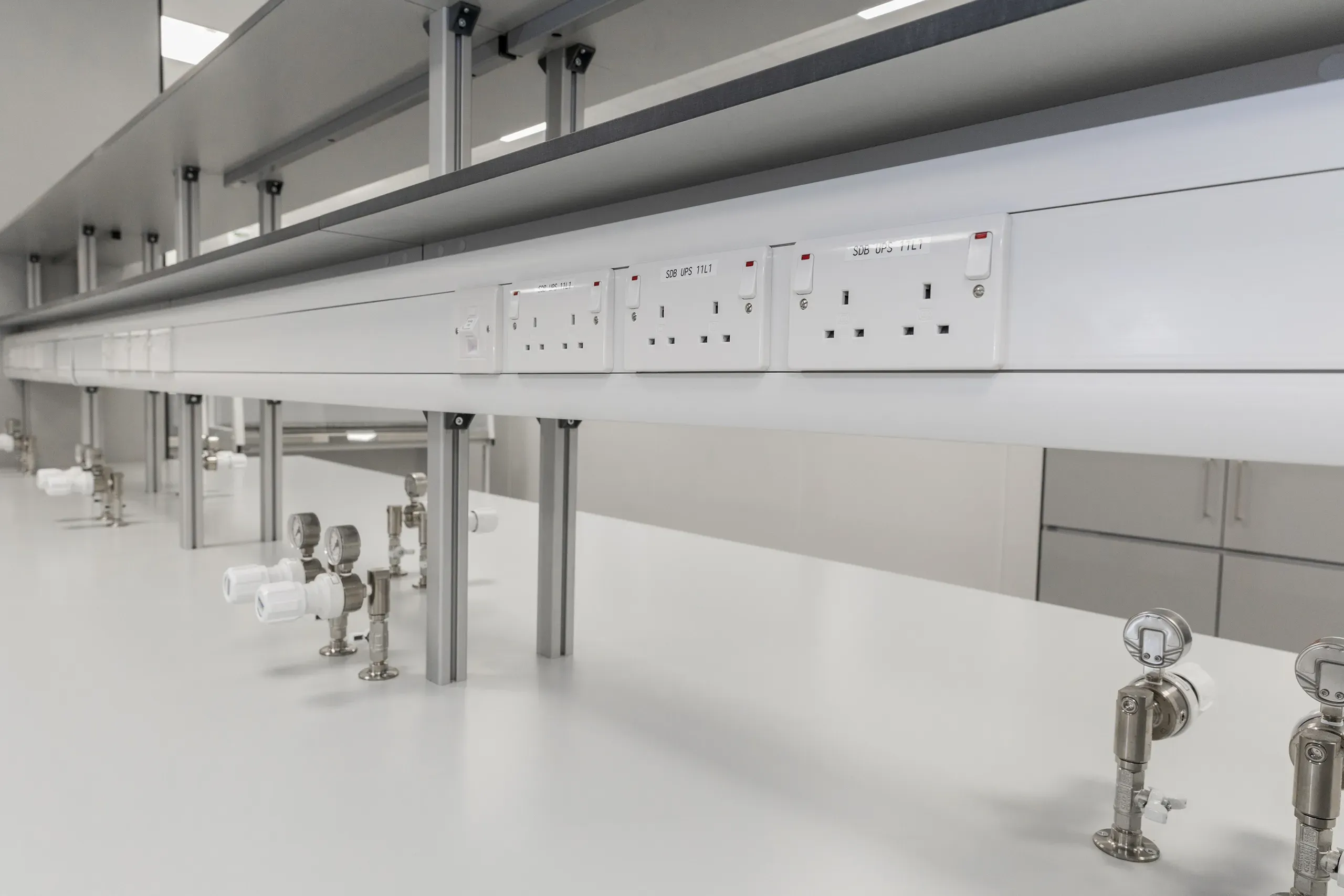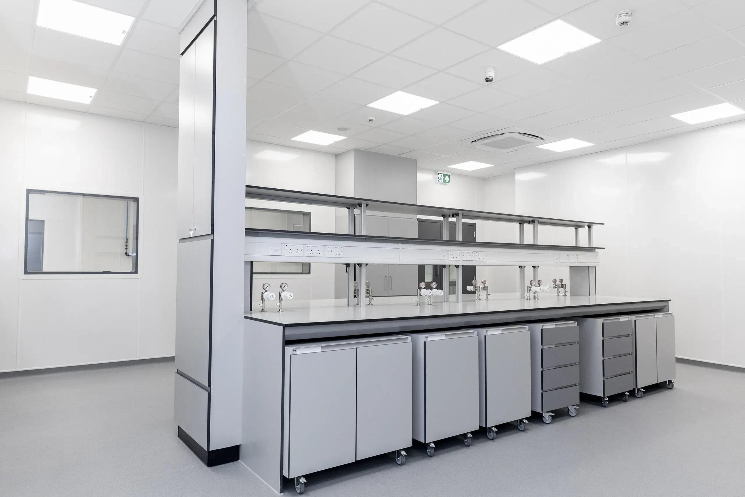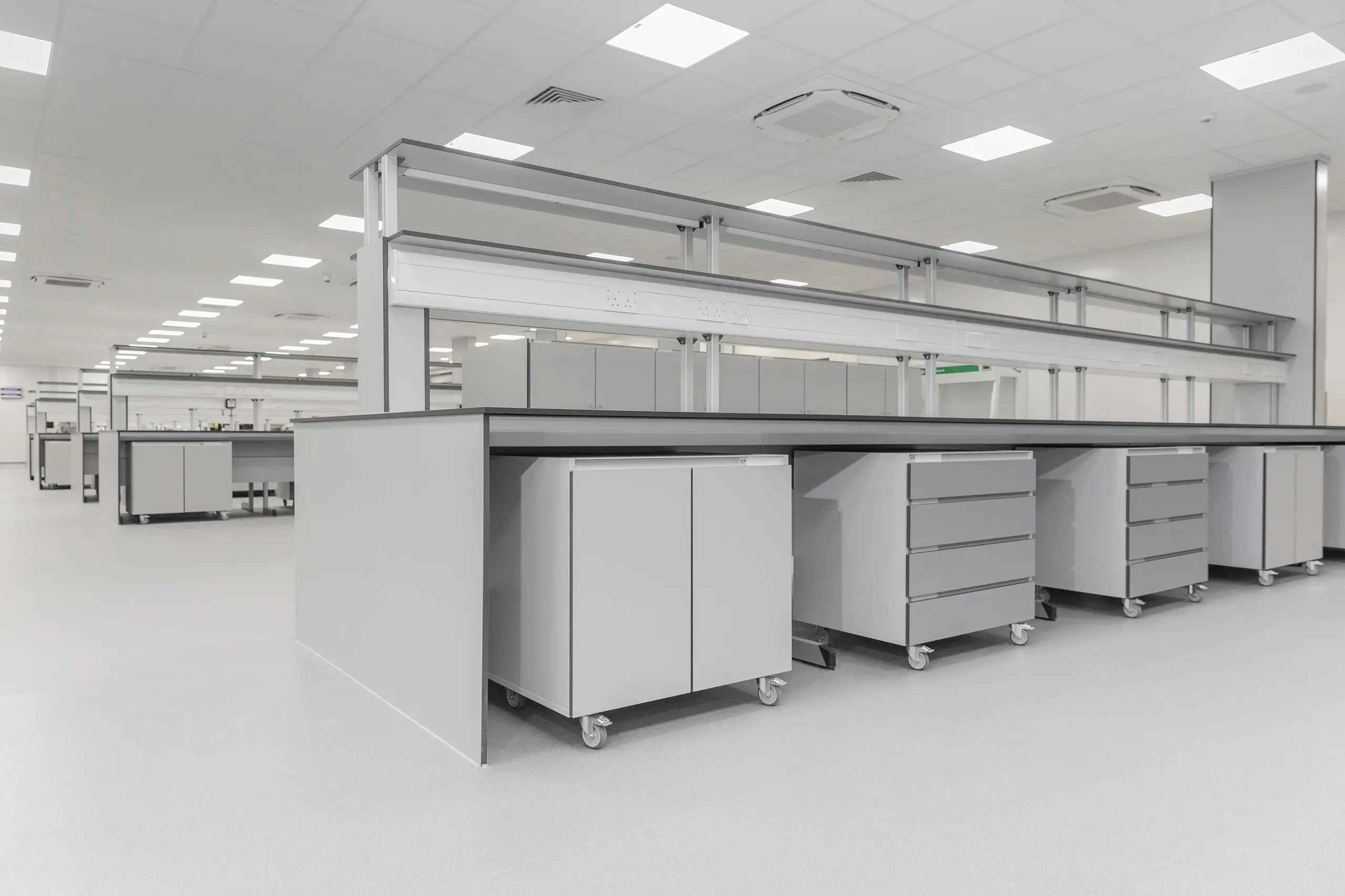 The bespoke laboratory furniture manufactured and installed by SB Labs spans 19 rooms and includes laboratory benches with over-bench shelving, vertical risers, and safety stations. All the worktops were manufactured from Trespa Toplab Plus, renowned for their durability and chemical resistance. We also supplied 316 stainless steel sinks to meet strict pharmaceutical standards, all supported by our Pedestal System.