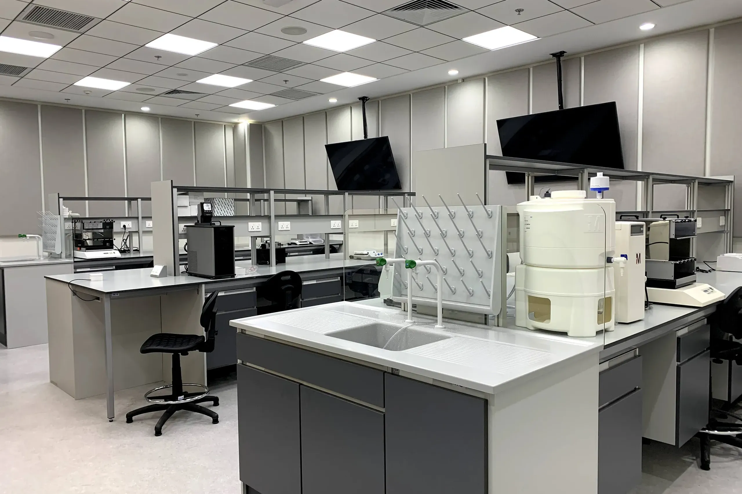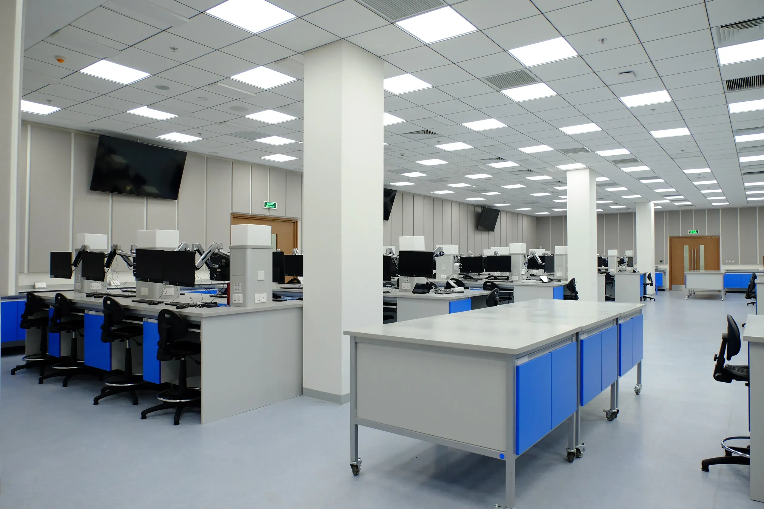 The focus was on the client’s requirement of creating premium and highly flexible flagship laboratory environments. This was achieved by supplying the SB Labs Exemplaire C Frame and Column Systems, which combine heavy-duty functionality with attractive contemporary styling. Both systems facilitate under-bench sliding suspended units that can traverse the full bench length free of obstruction and interruption.