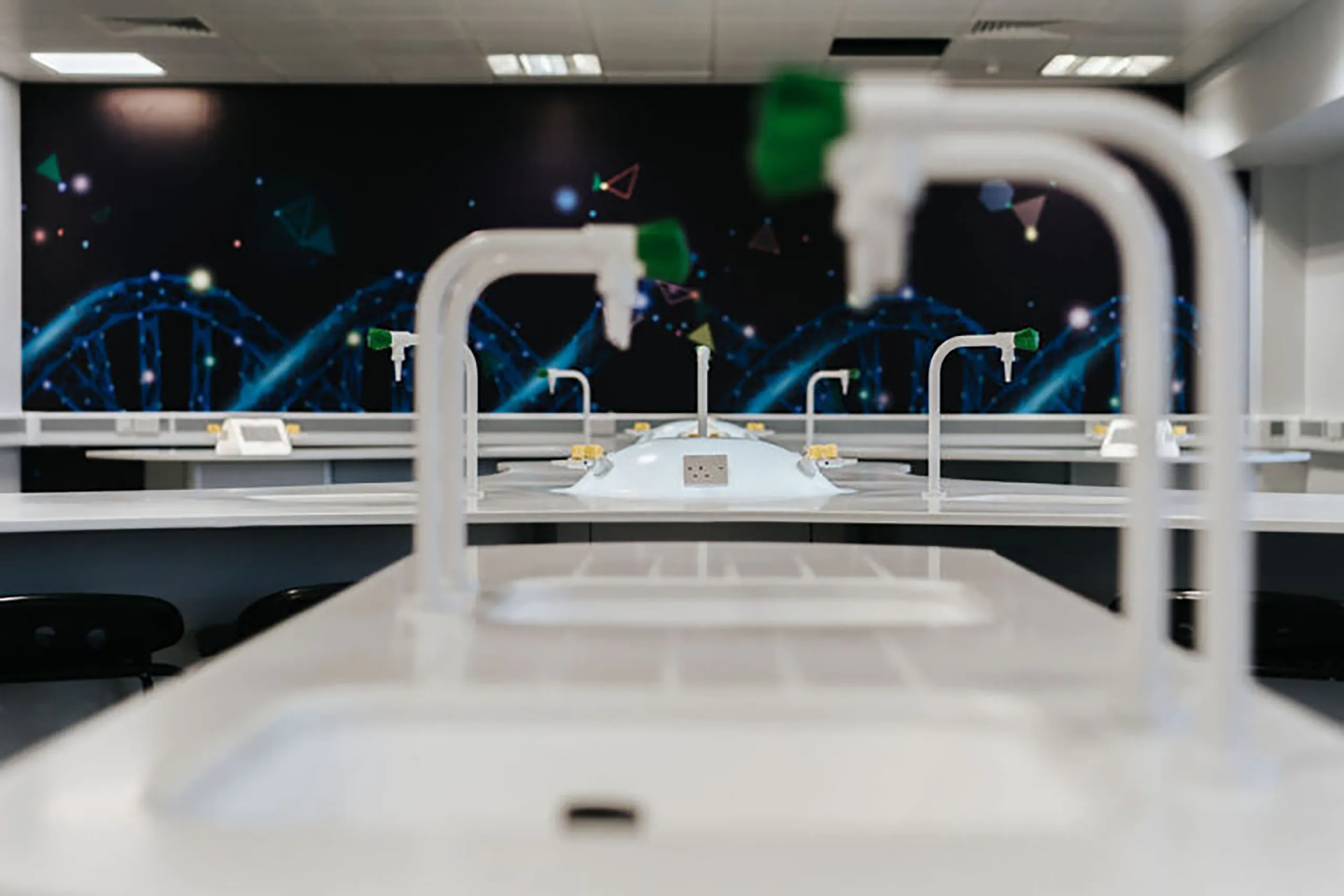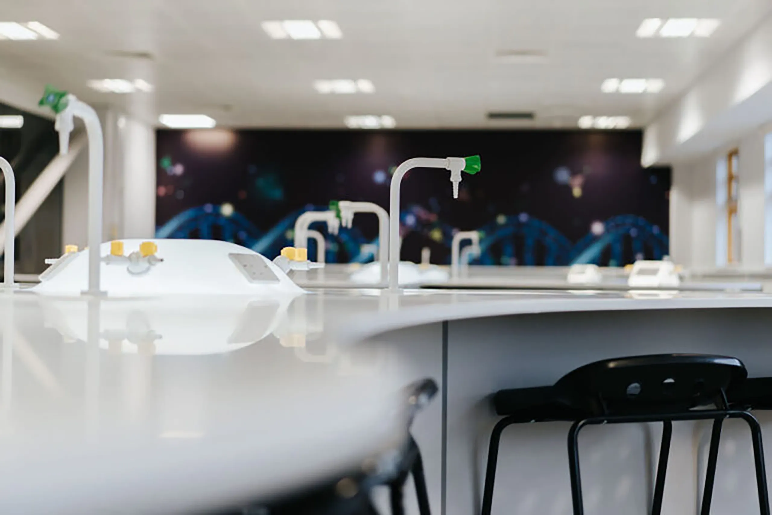 The Spacestations incorporate thermoformed Corian service turrets which are fabricated at our facilities in Manchester and the turrets are underlit with LED panels. Seamlessly integrated Corian sinks are included which eliminate dirt-traps associated with other sink types. The gas, water and vacuum outlets are supplied by BROEN-LAB A/S.