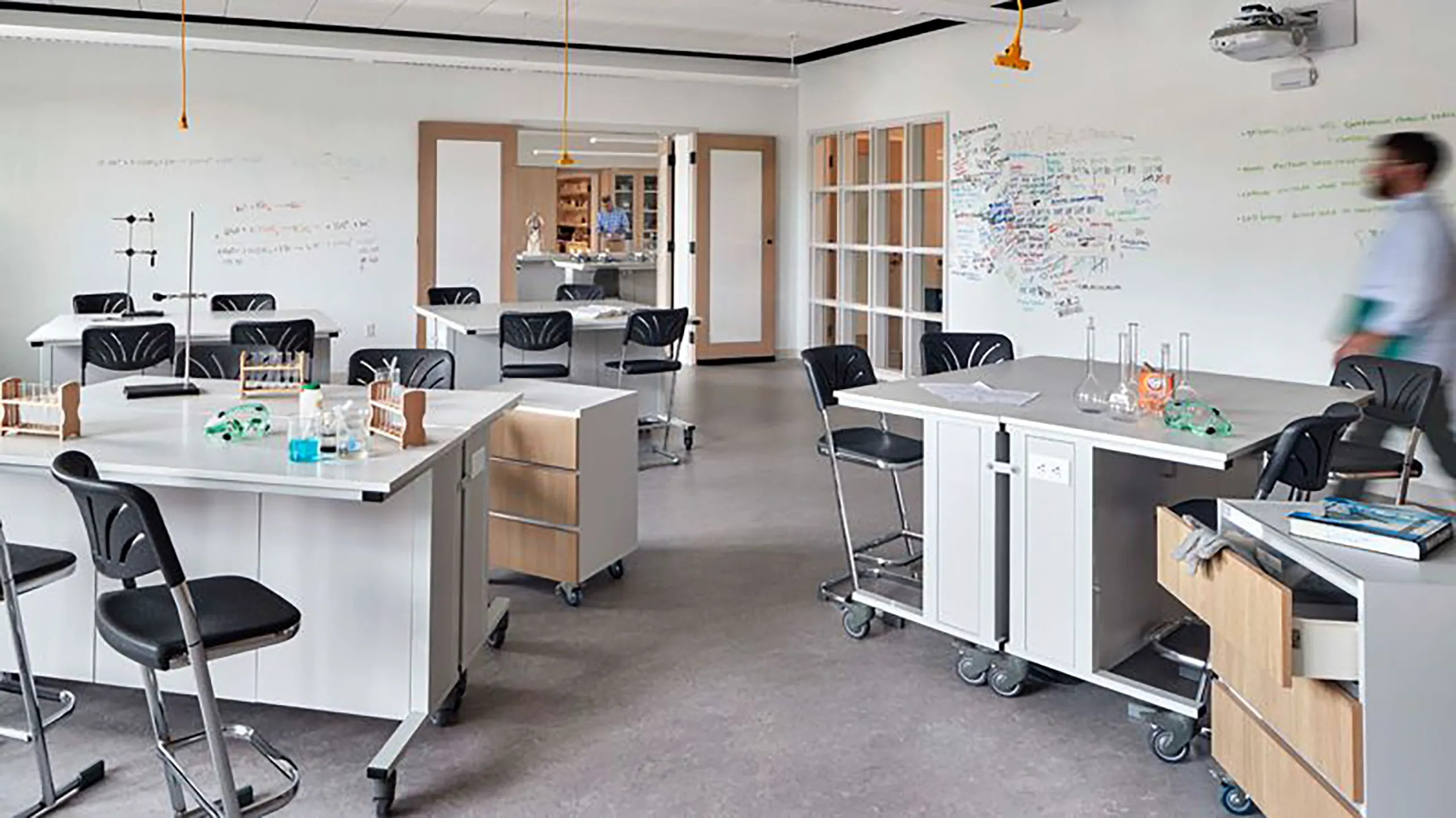 Movable lab desks with centralized service points, such as Service Towers and table Systems, facilitate quick reconfiguration from traditional classroom layouts to collaborative lab spaces, engaging students and improving attention to achieve learning objectives.