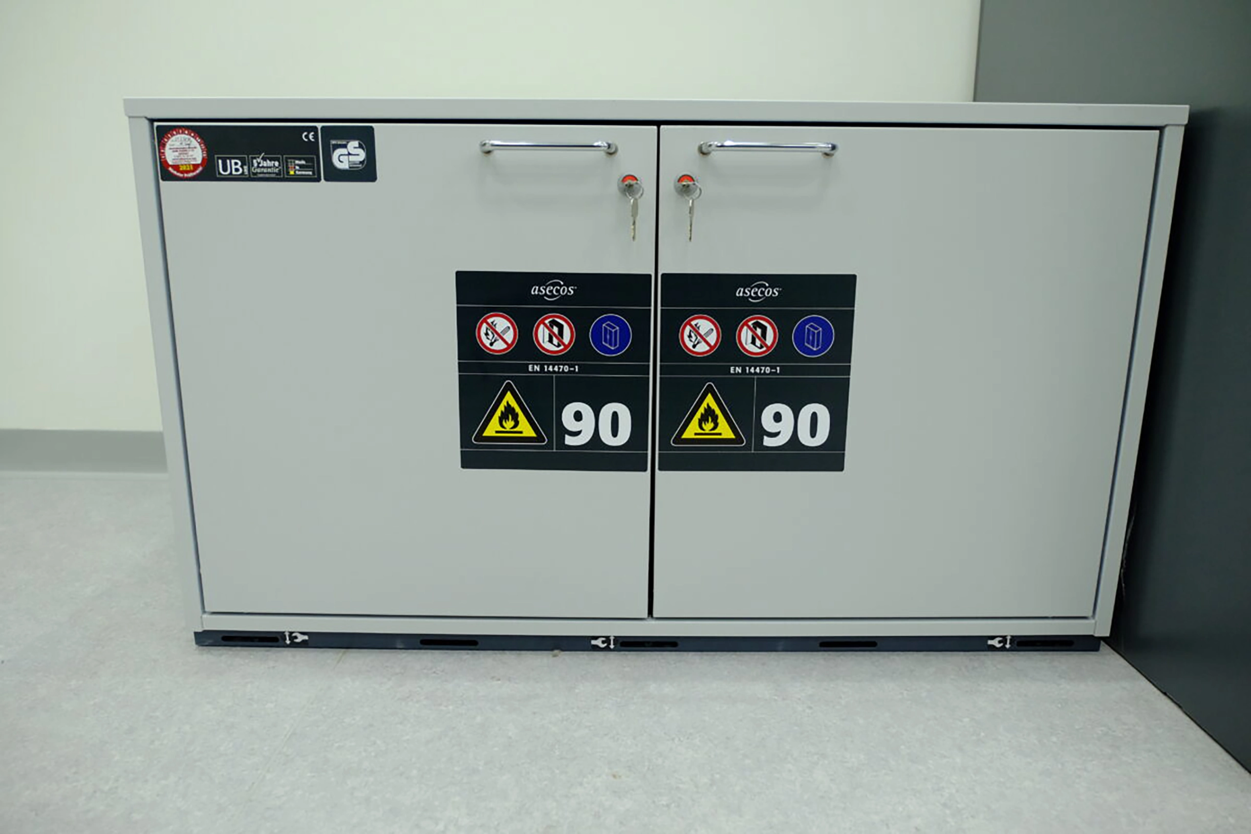 Hazardous and especially flammable chemicals might require fire-rated storage cabinets, potentially with a fire suppression system or fire alarm fitted.