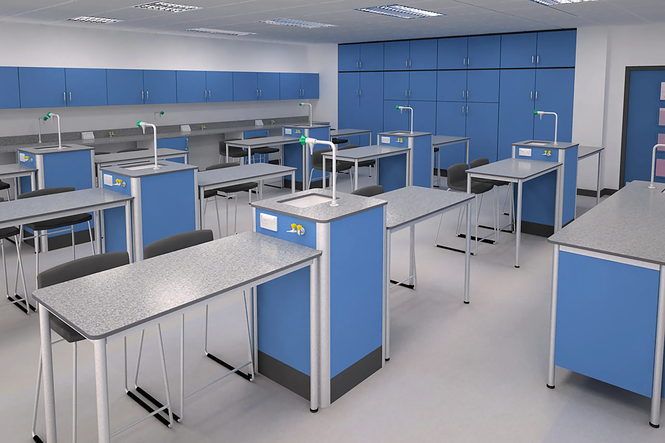The International College of Spain based in Madrid is refurbishing laboratories and a prep room. The reasons for doing this are non – compliances which have been identified and which represent safety hazards in old and out of date science labs, the existing labs are old fashioned and restrictive of modern pedagogy to say nothing of lacking in appeal to attract students to STEM studies. They lack the flexibility to enable a variety of teaching style and in the learning experience. The school want a system which is flexible and whilst this can be accommodated with contemporary fixed furniture designs, the preference is for moveable furniture which can be reconfigured, quickly, easily and safely but with easy access in all areas to a full range of laboratory services. The school wanted to conduct practical science with students working in groups but wanted to avoid the restrictive and safety implications of confining this activity to perimeter benching with students facing the walls (out of teacher sight line) whilst working with naked flames, boiling liquids and chemicals. A couple of particularly difficult factors to try and work around were existing structural columns in the room, and the desire to use the existing service locations to keep the building works cost down.