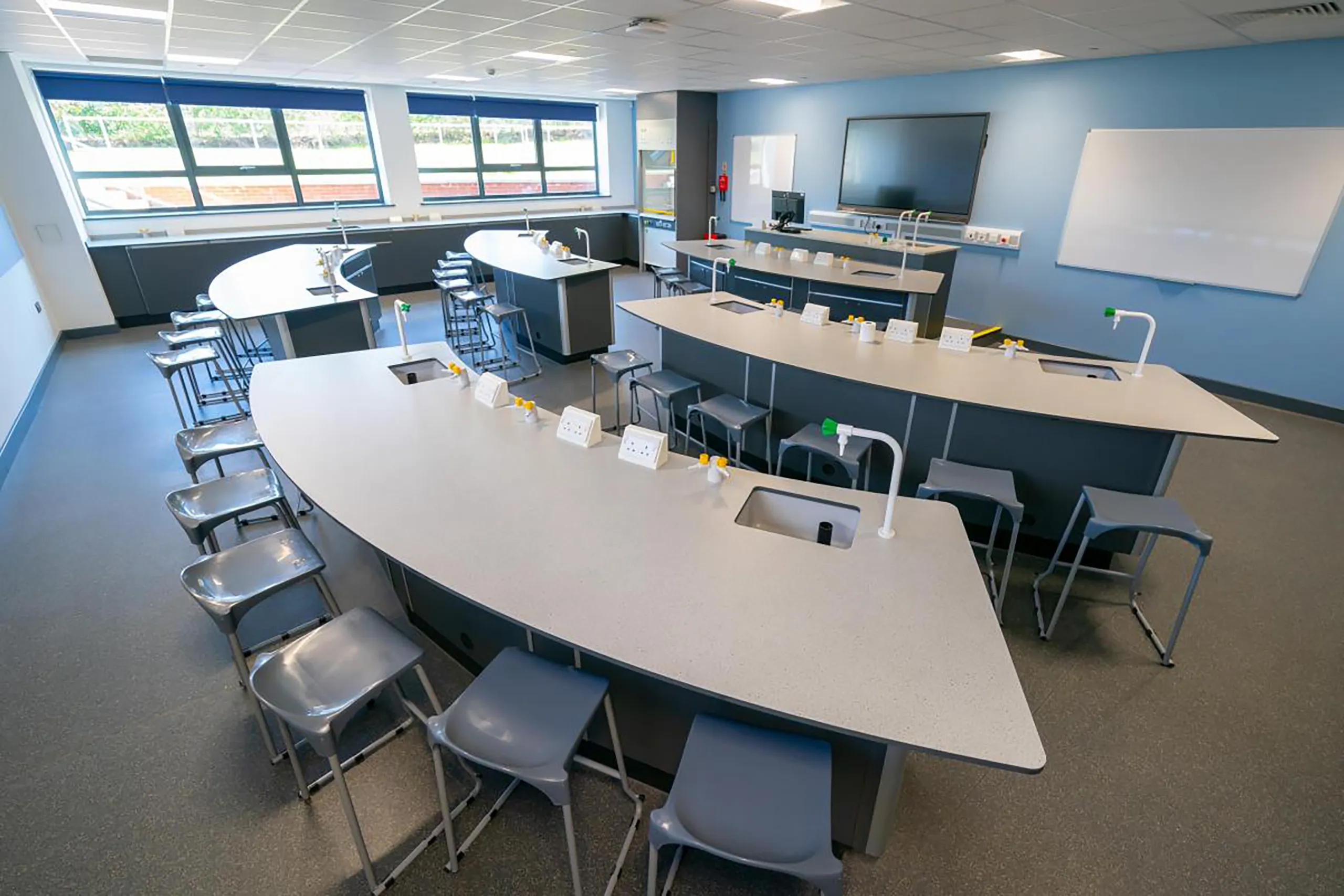 Fully serviced Crescent-shaped student islands and teacher’s demo desks were designed to meet the high school’s specific requirements and provide students with lab spaces that inspire them.