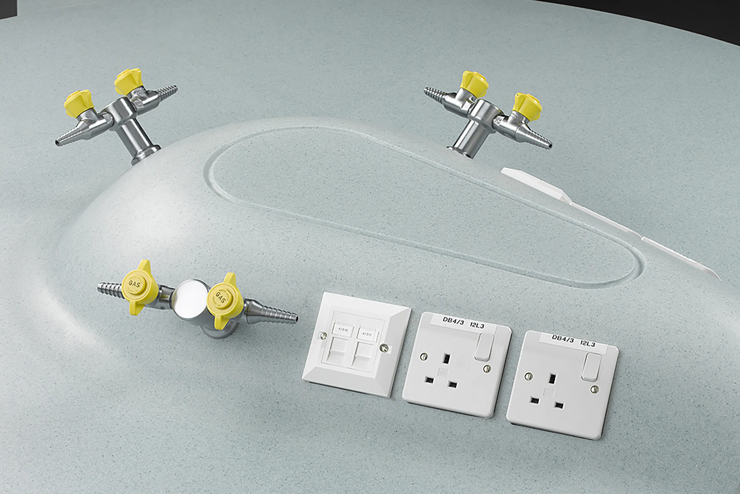 The lab furniture system chosen is the Saturn & Mercury with the moulded turret, Corian worktops and integrated sinks. Additional work surfaces, storage and services are provided around the perimeter benching.