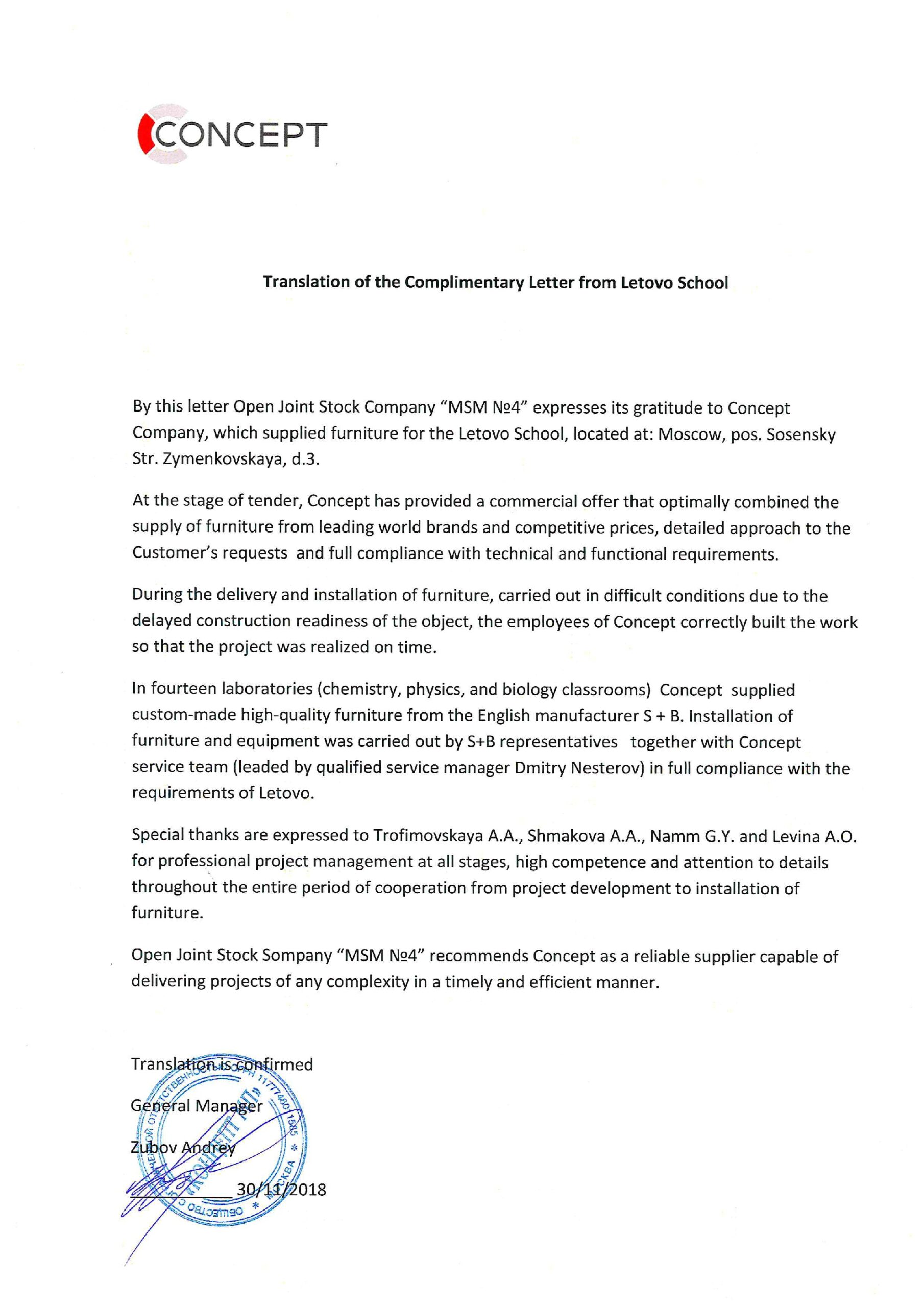 Following the SB Labs furniture installation at Letovo School, Concept, our agent in Russia, gets a glowing reference