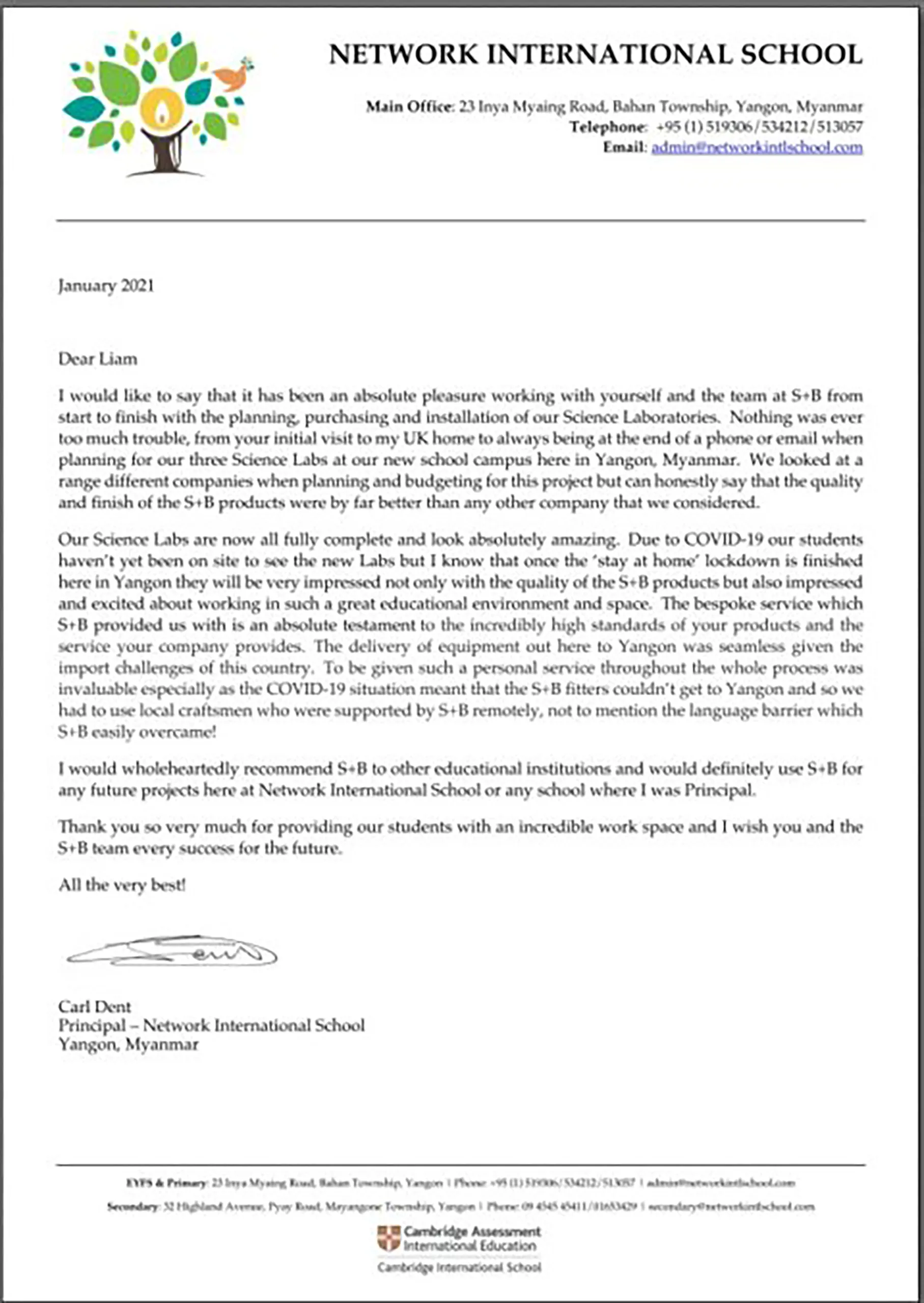SB Labs receive excellent feedback from Carl Dent, the Network’s Director, the design, manufacture, delivery and installation of science furniture systems and fume cupboards for 3 x Science Labs and 2 x Prep Rooms.