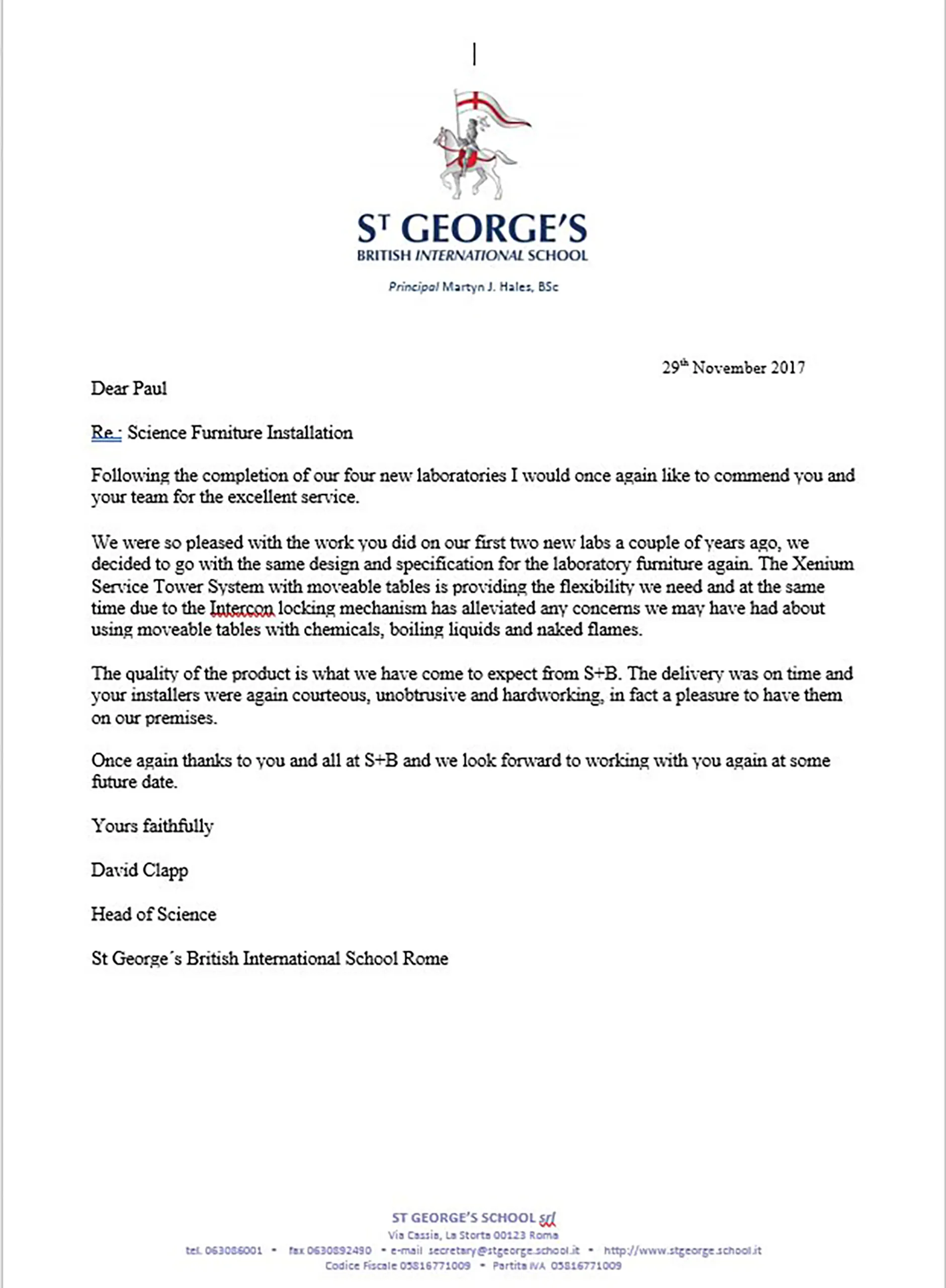 Following the completion of a second phase laboratory furniture and fume cupboard installation, we were delighted to receive the kind words below from another satisfied international school.