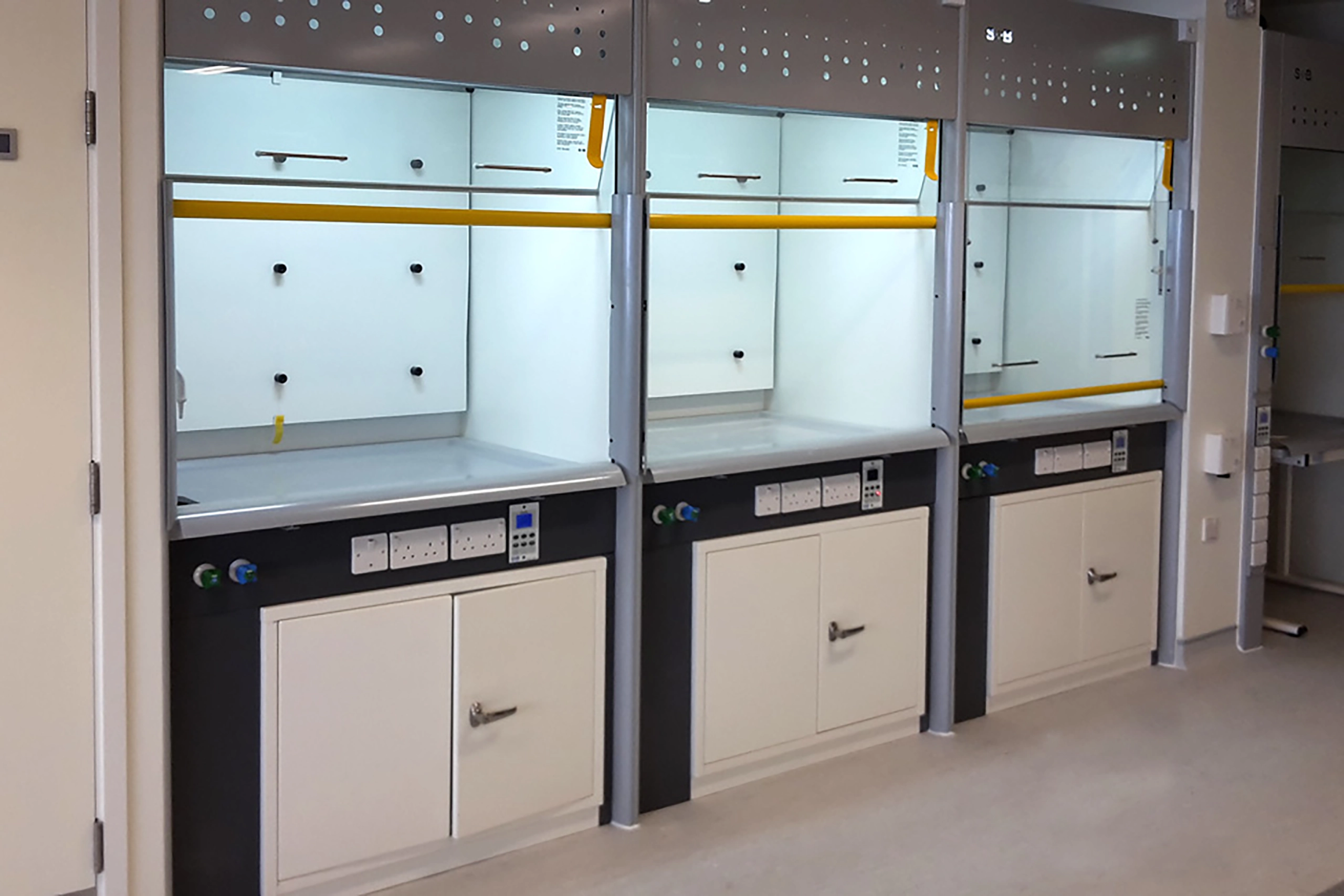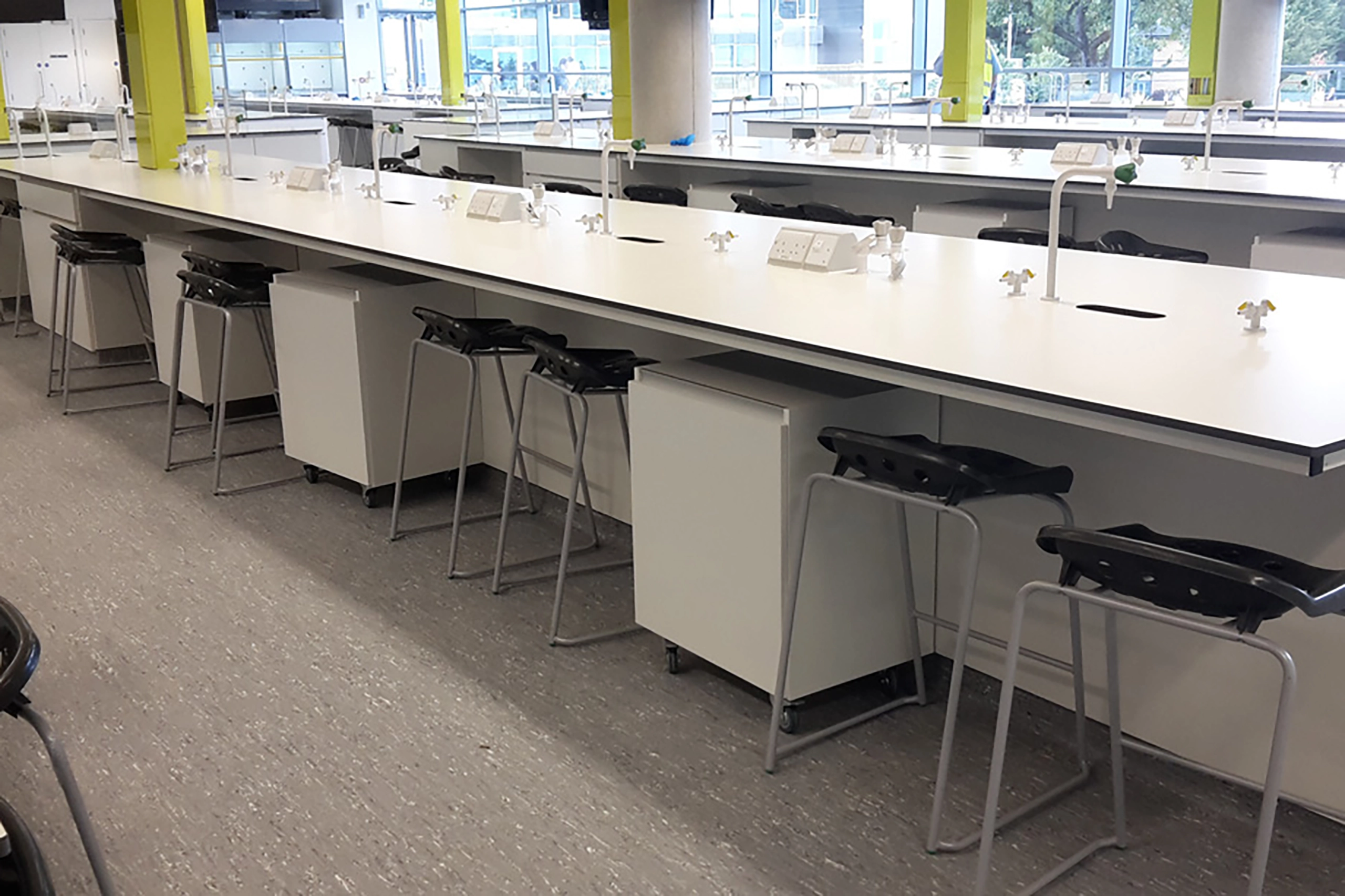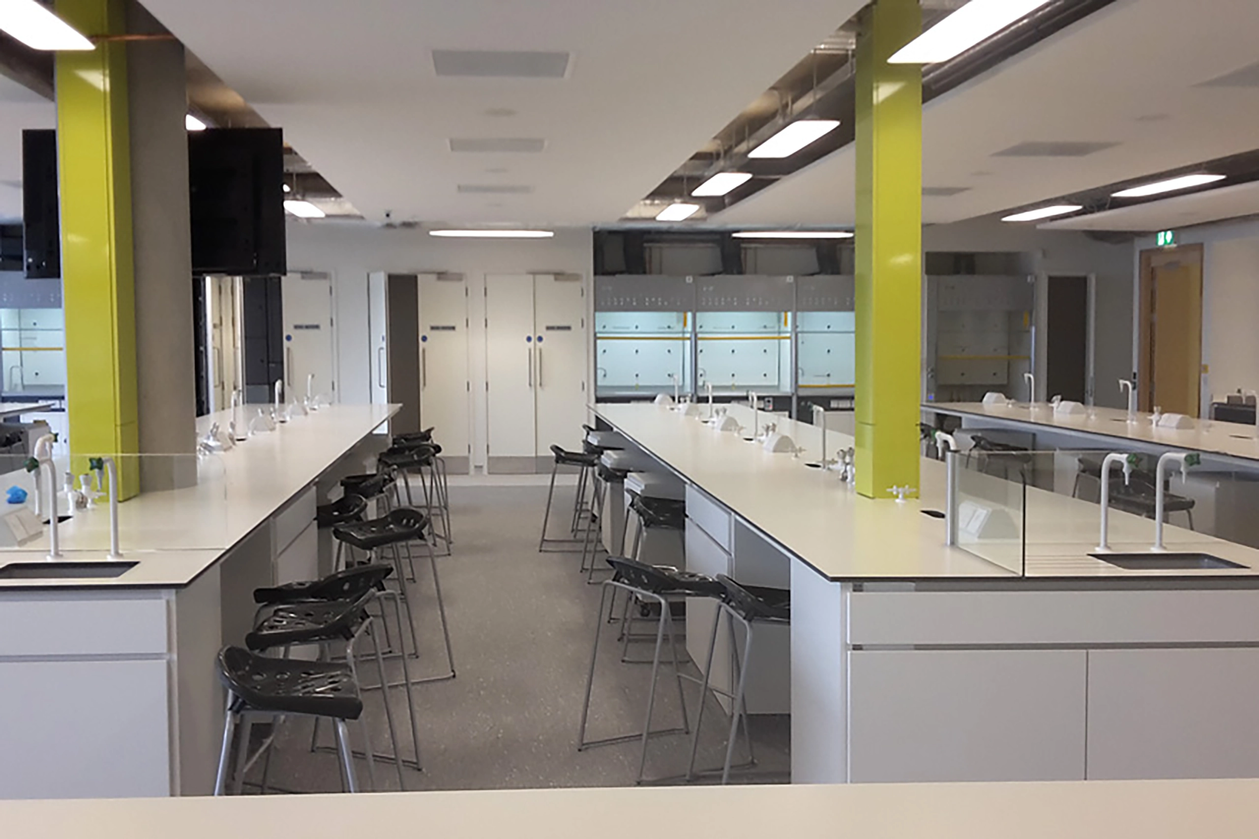 SB Labs have supplied and installed Utilaire cantilever benching with Trespa worktops and mobile cabinets along with Safety Stations and Ecoline low velocity solid skin Fume Cupboards. The Architects wanted clean lines and open spaces both above and below bench level, specific architect led details include the flooring being coved around the steel bench support structure and green high gloss laminate to each Safety Station.
